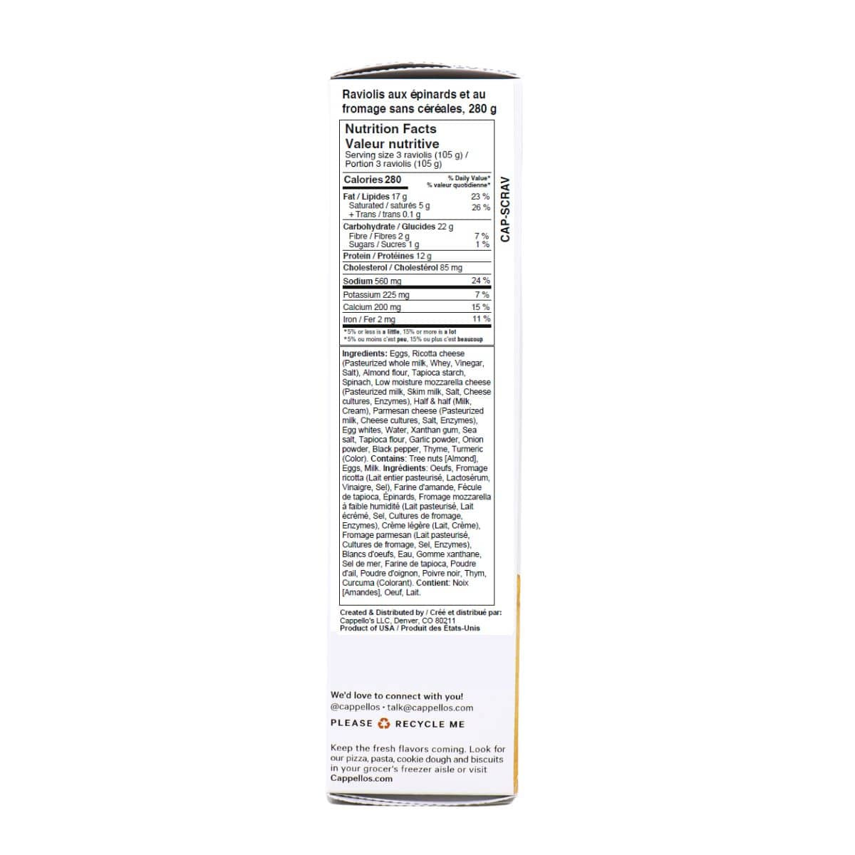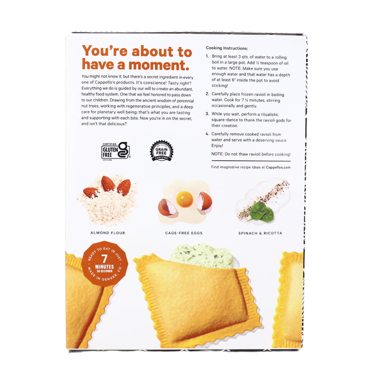 You’ve probably had spinach and cheese together before, but not like this. Skip the spinach and cheese omlete, ditch the spinach and omlet quiches, because Cappello’s Spinach & Cheese Ravioli reinvents this classic combo. With ricotta, parmesan, mozzarella, and a grain-free almond flour pasta shell, this gluten-free ravioli is deliciously tender and packed with protein! Handcrafted, frozen fresh, and ready in just 7 minutes and 30 seconds, that’s a dinner win in record time. With no gluten, no grains, and no seed oils, Cappello's spinach and cheese ravioli is unlike anything you've had before!