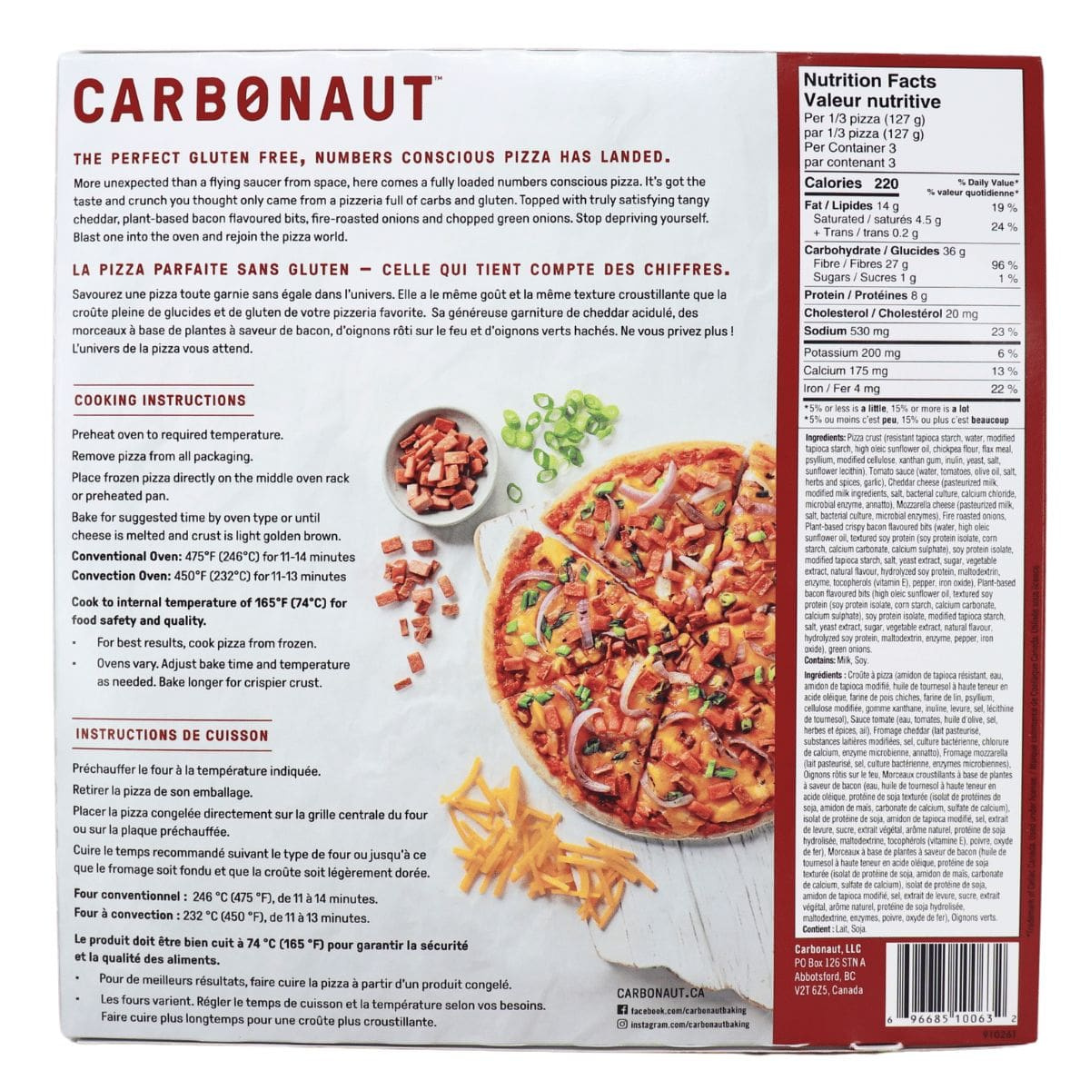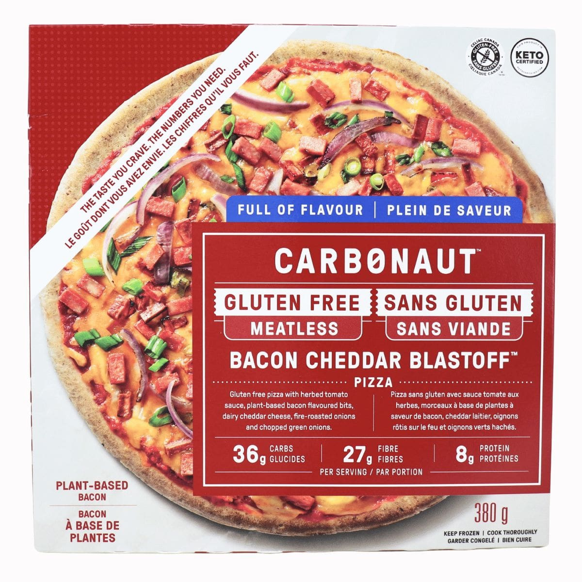 Pizza crust (Resistant tapioca starch, water, modified tapioca starch, high oleic sunflower oil, chickpea flour, flax meal, psyllium, modified cellulose, xanthan gum, inulin, yeast, salt, sunflower lecithin), Tomato sauce (Water, tomatoes, olive oil, salt, herbs and spices, garlic), Cheddar cheese (Pasteurized milk, modified milk ingredients, salt, bacterial culture, calcium chloride, microbial enzyme, annatto), Mozzarella cheese (Pasteurized milk, salt, bacterial culture, microbial enzymes), Fire roasted onions, Plant-based crispy bacon flavoured bits (Water, high oleic sunflower oil, textured soy protein [Soy protein isolate, corn starch, calcium carbonate, calcium sulphate], soy protein isolate, modified tapioca starch, salt, yeast extract, sugar, vegetable extract, natural flavour, hydrolyzed soy protein, maltodextrin, enzyme, tocopherols [Vitamin E], pepper, iron oxide), Plant-based bacon flavoured bits (High oleic sunflower oil, textured soy protein [Soy protein isolate, corn starch, calcium carbonate, calcium sulphate], soy protein isolate, modified tapioca starch, salt, yeast extract, sugar, vegetable extract, natural flavour, hydrolyzed soy protein, maltodextrin, enzyme, pepper, iron oxide), Green onions.
