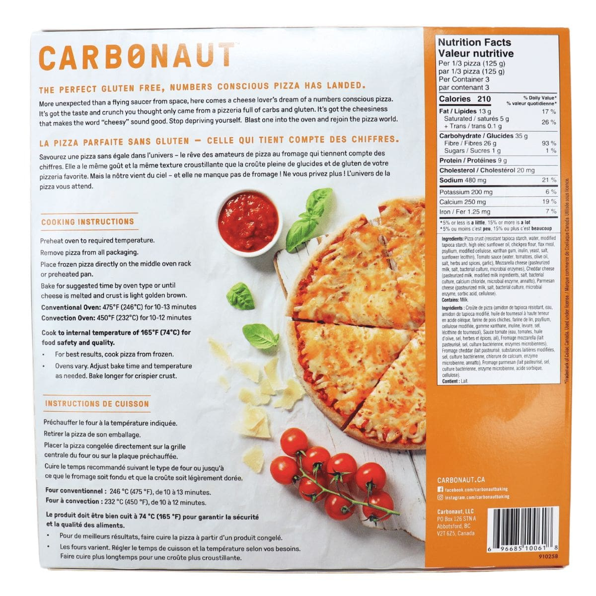 Pizza crust (Resistant tapioca starch, water, modified tapioca starch, high oleic sunflower oil, chickpea flour, flax meal, psyllium, modified cellulose, xanthan gum, inulin, yeast, salt, sunflower lecithin), Tomato sauce (Water, tomatoes, olive oil, salt, herbs and spices, garlic), Mozzarella cheese (Pasteurized milk, salt, bacterial culture, microbial enzymes), Cheddar cheese (Pasteurized milk, modified milk ingredients, salt, bacterial culture, calcium chloride, microbial enzyme, annatto), Parmesan cheese (Pasteurized milk, salt, bacterial culture, microbial enzyme, sorbic acid, cellulose).