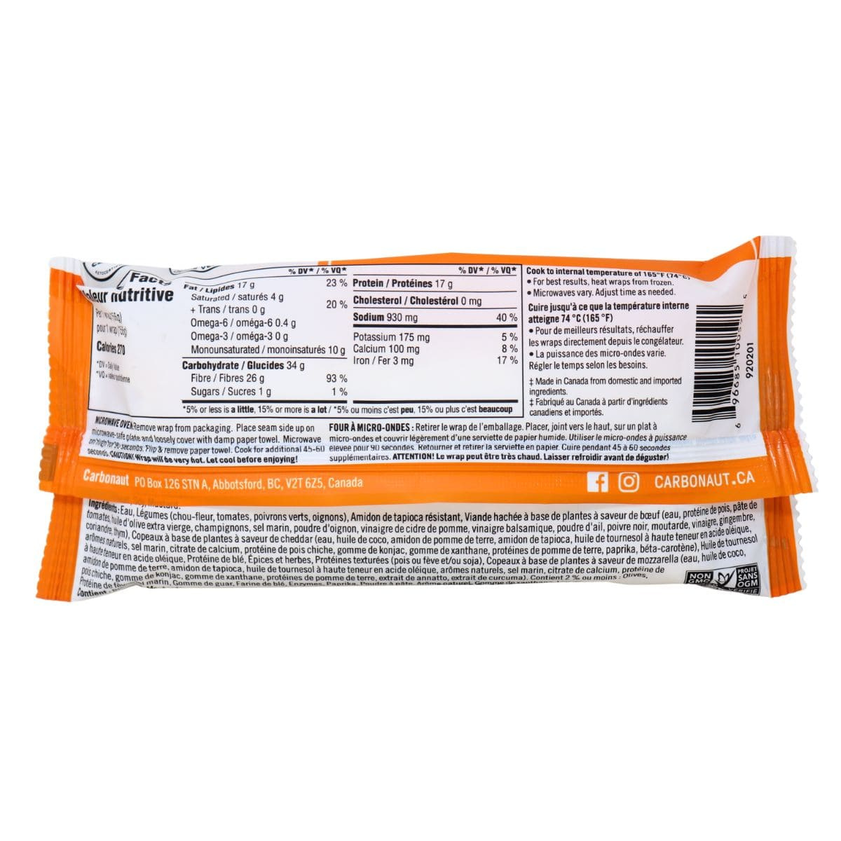 Savory nacho-style seasoning turns this frozen wrap into comfort food deliciousness. Carbonaut Plant-Based Loaded Nacho Wrap layers savoury nacho-inspired seasoning with vegetables and plant-based protein, wrapped in a soft low-carb flour tortilla that heats evenly and eats cleanly. It’s built to deliver that classic cheesy nacho satisfaction in a format that works for quick meals when you need something hearty fast.