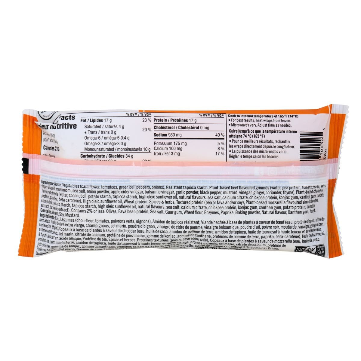 Water, Vegetables (Cauliflower, tomatoes, green bell peppers, onions), Resistant tapioca starch, Plant based beef flavoured grounds (Water, pea protein, tomato paste, extra virgin olive oil, mushroom, sea salt, onion powder, apple cider vinegar, balsamic vinegar, garlic powder, black pepper, mustard, vinegar, ginger, coriander, thyme), Plant based cheddar flavoured shreds (Water, coconut oil, potato starch, tapioca starch, high oleic sunflower oil, natural flavours, sea salt, calcium citrate, chickpea protein, konjac gum, xanthan gum), Wheat protein, Potato starch, Textured protein (Pea or fava and/or soy), Plant based mozzarella flavoured shreds (Water, coconut oil, potato starch, tapioca starch, high oleic sunflower oil, natural flavours, sea salt, calcium citrate, chickpea protein, konjac gum, xanthan gum), Contains 2% or less: Olives, Fava bean protein, Sea salt, Guar gum, Wheat flour, Enzymes, Paprika, Baking powder, Natural flavour, Xanthan gum, Yeast.