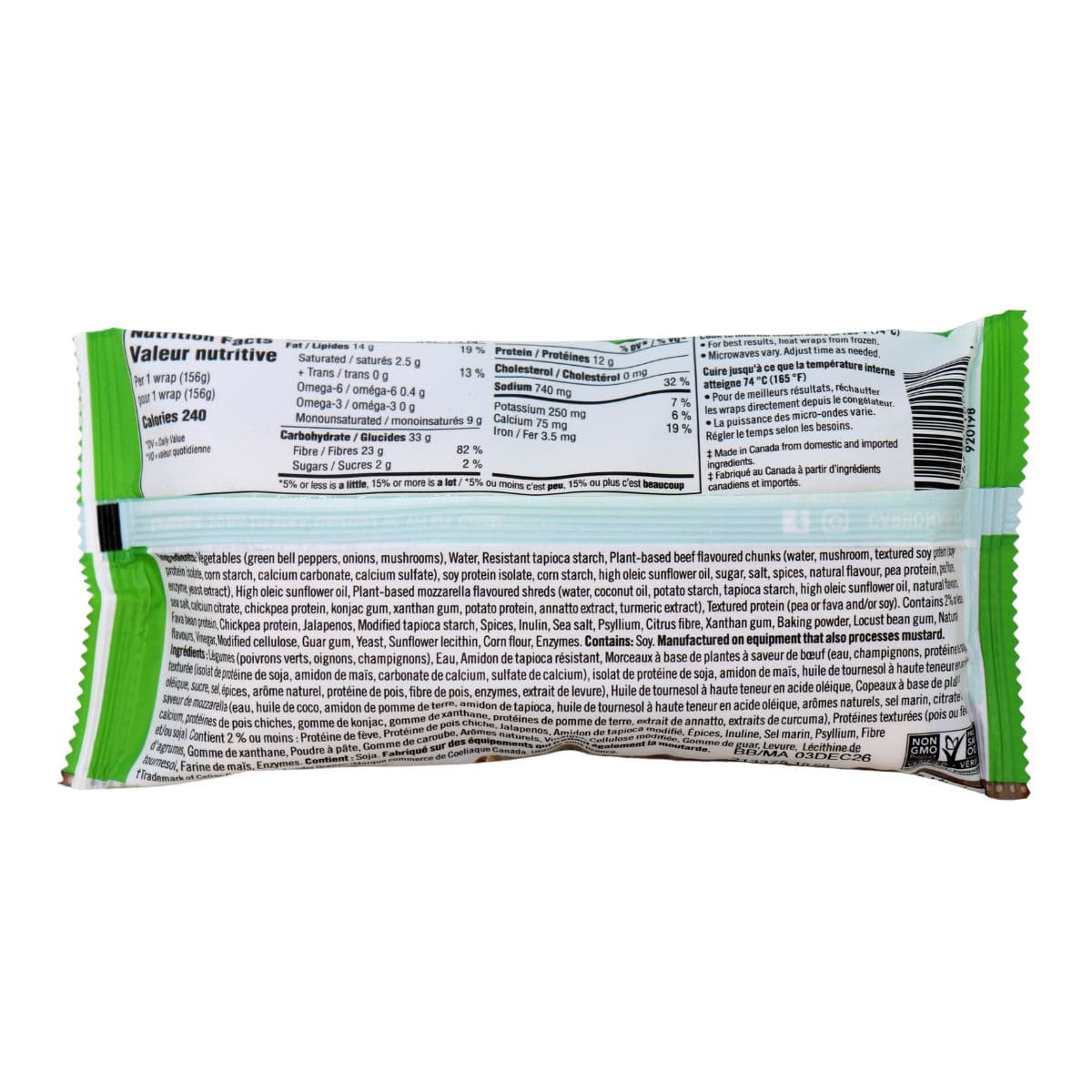 Vegetables (Green bell peppers, onions, mushrooms), Water, Resistant tapioca starch, Plant based beef flavoured chunks (Water, mushroom, textured soy protein [Soy protein isolate, corn starch, calcium carbonate, calcium sulfate], soy protein isolate, corn starch, high oleic sunflower oil, sugar, salt, spices, natural flavour, pea protein, pea fibre, enzyme, yeast extract), High oleic sunflower oil, Plant based mozzarella flavoured shreds (Water, coconut oil, potato starch, tapioca starch, high oleic sunflower oil, natural flavours, pea protein isolate, chickpea protein, konjac gum, xanthan gum, potato protein, annatto extract, turmeric extract), Textured protein (Pea or fava and/or soy). Contains 2% or less: Fava bean protein, Chickpea protein, Jalapenos, Modified tapioca starch, Spices, Inulin, Sea salt, Psyllium, Citrus fibre, Xanthan gum, Baking powder, Locust bean gum, Natural flavours, Modified cellulose, Guar gum, Yeast, Sunflower lecithin, Corn flour, Enzymes.