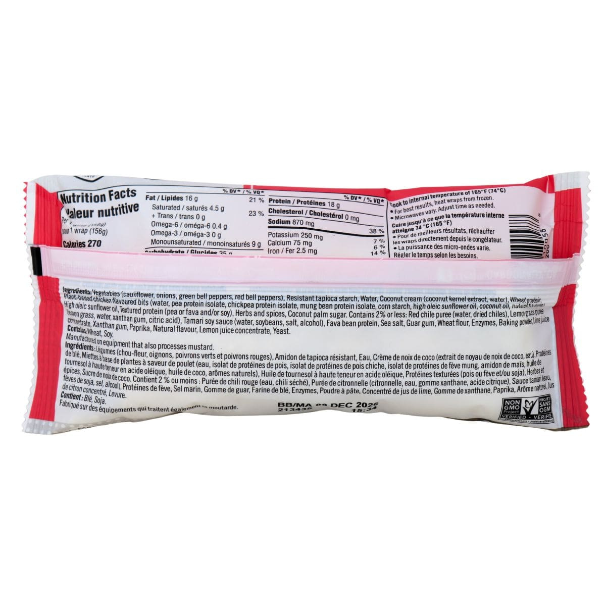 Vegetables (Cauliflower, onions, green bell peppers, red bell peppers), Resistant tapioca starch, Water, Coconut cream (Coconut kernel extract, water), Wheat protein, Plant based chicken flavoured bits (Water, pea protein isolate, chickpea protein isolate, mung bean protein isolate, corn starch, high oleic sunflower oil, coconut oil, natural flavour), Textured protein (Pea or fava and/or soy), Herbs and spices, Coconut palm sugar. Contains 2% or less: Red chile puree (Water, dried chiles), Lemongrass puree (Lemongrass, water), Xanthan gum, Citric acid, Tamari soy sauce (Water, soybeans, salt, alcohol), Fava bean protein, Sea salt, Guar gum, Wheat flour, Enzymes, Baking powder, Lime juice concentrate, Yeast.