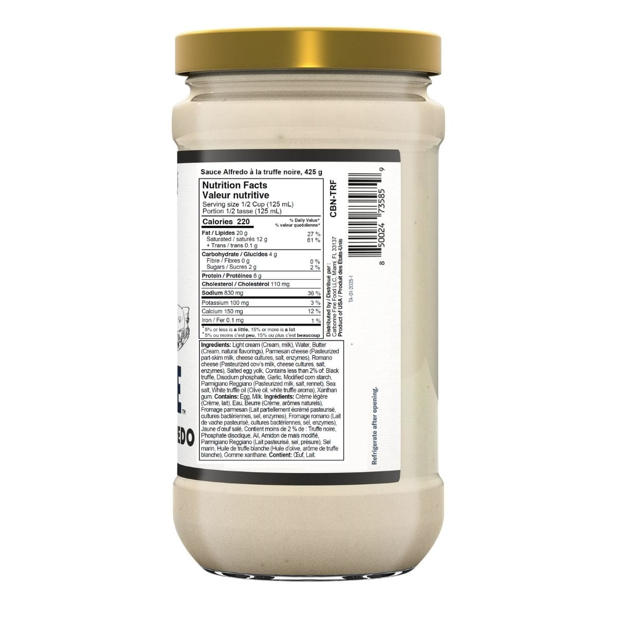 Light cream (Cream, milk), Water, Butter (Cream, natural flavorings), Parmesan cheese (Pasteurized part-skim milk, cheese cultures, salt, enzymes), Romano cheese (Pasteurized cow’s milk, cheese cultures, salt, enzymes), Salted egg yolk, Contains less than 2% of: Black truffle, Disodium phosphate, Garlic, Modified corn starch, Parmigiano Reggiano (Pasteurized milk, salt, rennet), Sea salt, White truffle oil (Olive oil, white truffle aroma), Xanthan gum.