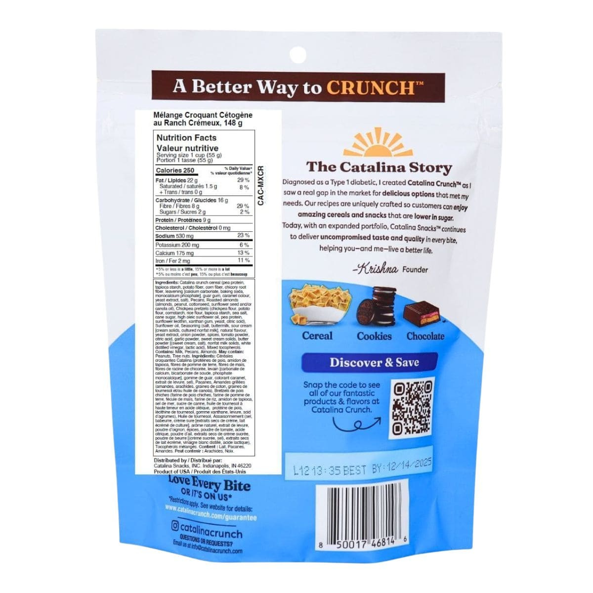 Catalina Crunch Cereal (Pea Protein, Tapioca Starch, Potato Fiber, Corn Fiber, Chicory Root Fiber, Leavening [Calcium Carbonate, Baking Soda, Monocalcium Phosphate], Guar Gum, Caramel Color, Yeast Extract, Salt), Pecans, Roasted Almonds (Almonds, Peanut, Cottonseed, Sunflower Seed and/or Canola Oil), Chickpea Pretzels (Chickpea Flour, Potato Flour, Cornstarch, Rice Flour, Tapioca Starch, Sea Salt, Cane Sugar, High Oleic Sunflower Oil, Pea Protein, Sunflower Lecithin, Xanthan Gum, Yeast, Citric Acid), Sunflower Oil, Seasoning (Salt, Buttermilk, Sour Cream [Cream Solids, Cultured Nonfat Milk], Natural Flavour, Yeast Extract, Onion Powder, Spices, Tomato Powder, Citric Acid, Garlic Powder, Sweet Cream Solids, Butter Powder [(Sweet Cream, Salt), Nonfat Milk Solids, White Distilled Vinegar, Lactic Acid), Mixed Tocopherols.