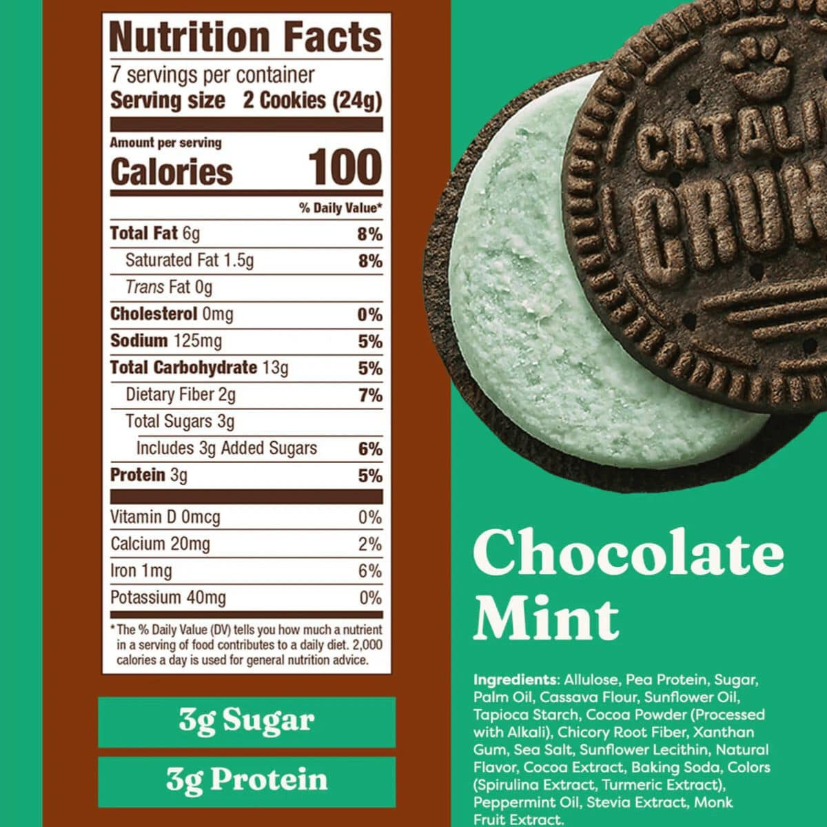 Catalina Crunch Chocolate Mint Sandwich Cookies, 120 g – Allulose, Pea protein, Sugar, Palm oil, Cassava flour, Sunflower oil, Tapioca starch, Cocoa powder (Processed with alkali), Chicory root fiber, Xanthan gum, Sea salt, Sunflower lecithin, Natural flavour, Cocoa extract, Baking soda, Colours (Spirulina extract, turmeric extract), Peppermint oil, Stevia extract, Monk fruit extract.