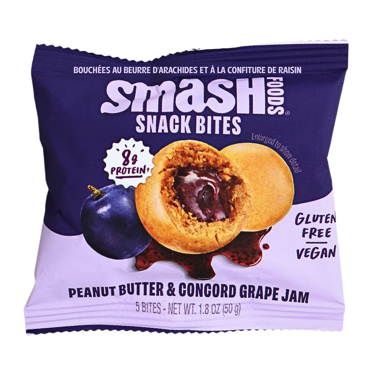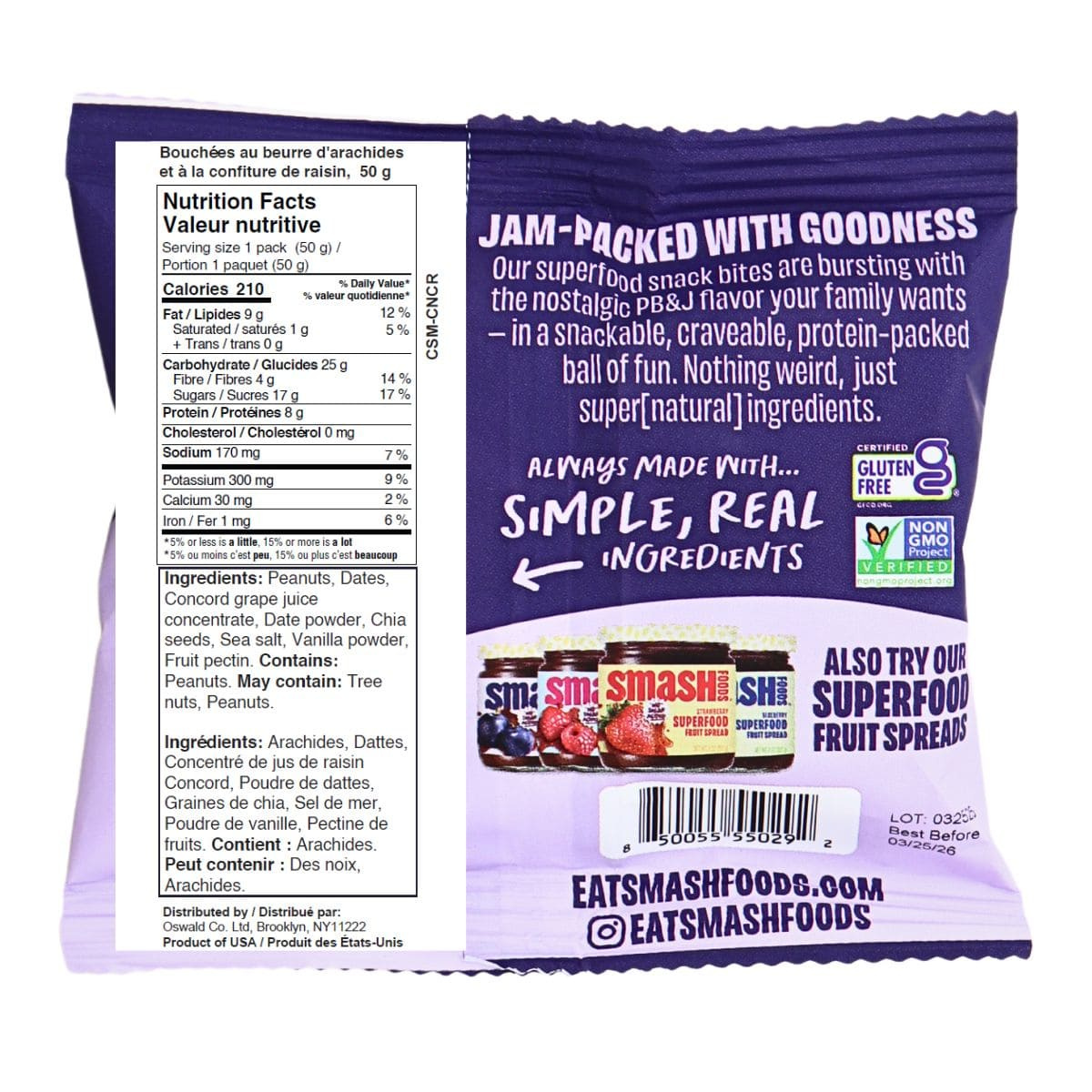 Get ready to SMASH your cravings with Chia Smash’s protein energy balls! Crunchy, creamy, sweet, and packed with everything you need, these peanut butter and jelly protein bites are like your favourite childhood sandwich, but all grown up! Because with 8g of plant-based protein, and a deliciously smooth peanut butter shell that wraps around a gooey, grape superfood chia jam filling, it’s the classic PB&J combo you love, but made smashingly more awesomer! Made with just a handful of simple ingredients like dates, peanuts, concord grapes, and chia seeds, these peanut butter bites are perfectly poppable to make you feel totally unstoppable.