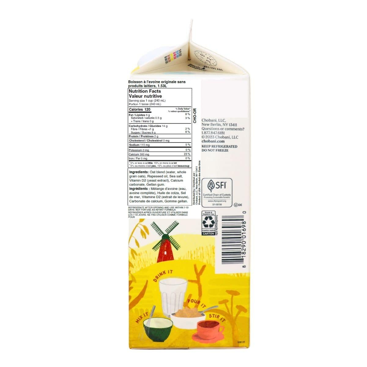 Pure, simple, and oat-rageously delicious! Chobani Oat Milk is the classic plant-based milk you can count on. You say Chobani, we hear ‘perfect for everything’! With no lactose, no nuts, and no gluten, Chobani's oat milk is rich and wholesome source of vitamin A, D, and calcium. Whether you're blending up a smoothie, pouring over cereal, or crafting the perfect latte, this is the unsweetened oat milk that does it all. Now that's t-oat-ally awesome!