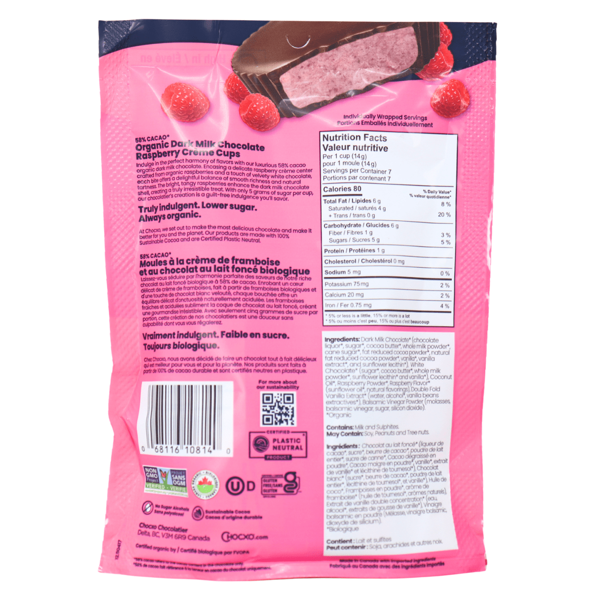 If you love the combination of rich chocolate and bright berry flavour, these cups are about to steal your heart. ChocXO 58% Dark Chocolate Raspberry Crème Cups feature a smooth, organic dark chocolate shell made with 58% cacao, filled with a luscious raspberry crème centre that’s fruity, slightly tangy, and irresistibly smooth.