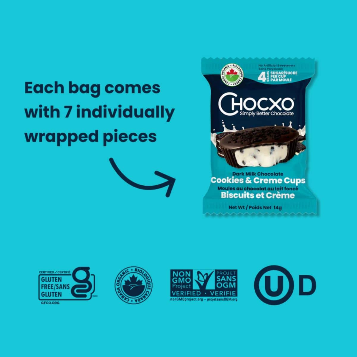 Some things are just better together, like Cookies and Creme, and you and ChocXO! With a creamy vanilla center that’s swirled with crunchy, gluten-free chocolate cookie bits that add just the right amount of crunch, every bite of ChocXO’s chocolate cups tastes like your favourite cookies & cream ice cream, but so much better! Because it’s all wrapped in a silky layer of 69% cacao dark milk chocolate and topped with even more crunchy chocolate cookie bits! With no artificial sweeteners or sugar alcohols, and only 4g of sugar, ChocXO’s cookies and creme chocolate cups are deliciously decadent but also surprisingly healthy–it’s a match made in heaven!