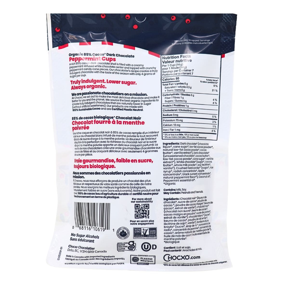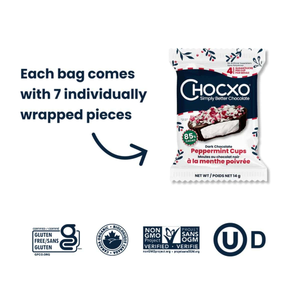 Why wait for Santa to bring you joy when you can unwrap happiness in every bite with ChocXO’s dark chocolate peppermint cups? With a rich 85% dark chocolate shell that’s so smooth and decadent enveloping a creamy, dreamy peppermint white chocolate center, this low-sugar chocolate cup is the epitome of a winter wonderland! Each cup is sprinkled with crunchy candy cane pieces for that extra dose of holiday magic! Made with simple organic ingredients, this gluten-free and keto-friendly candy cane chocolate will make this season a little sweeter, a little mintier, and a whole lot merrier!