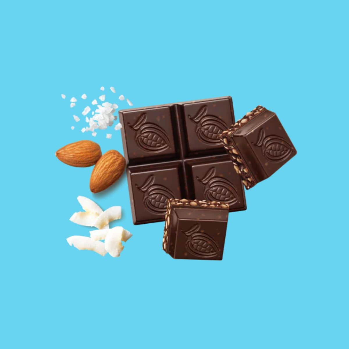 Organic 85% Cacao Dark Chocolate (Organic Cocoa Mass, Organic Cocoa Butter, Organic Low-Fat Cocoa Powder, Organic Cane Sugar, Organic Vanilla Extract), Organic Coconut, Organic Almonds, Sea Salt.