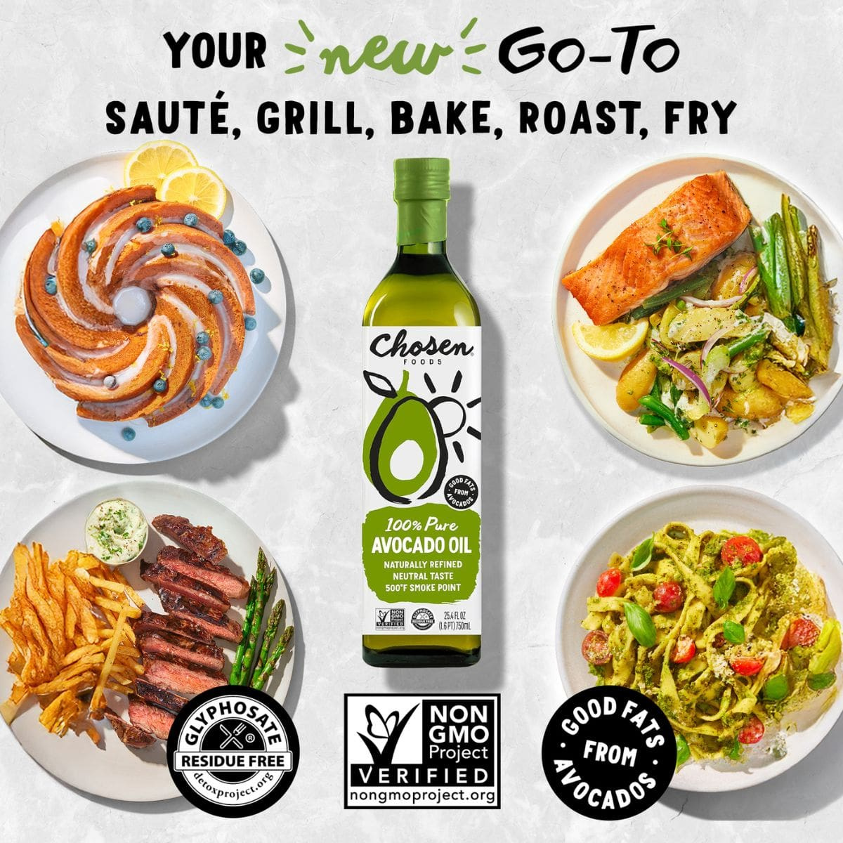 Is it getting hot in here or is it just Chosen Foods 100% Pure Avocado Oil? With a high smoke point of 260℃/500℉ nothing is too hot to handle for this oil! With its neutral flavour profile that makes it the perfect choice for all your cooking needs, it will become your favourite way to elevate your cooking. Using an expeller-press method, high quality oil is extracted from perfectly ripened avocados–without the use of excess heat or harsh chemicals. The results? A pure, naturally refined, non-GMO and glyphosate residue free avocado oil that contains 10g of monounsaturated fat per serving.