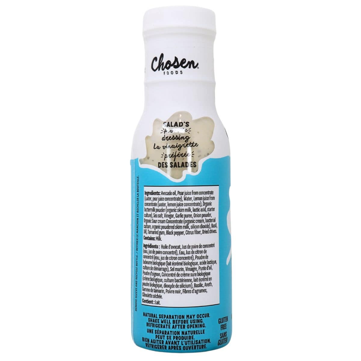 Chosen Foods Ranch Dressing is creamy, tangy and classic. With organic buttermilk, vinegar, dijon mustard, lemon juice, spices, and a dash of sea salt, this must-have recipe is tied together in a beautiful base of pure avocado oil.