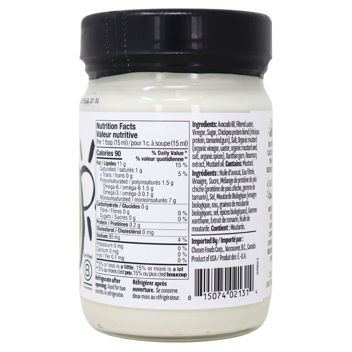 Avocado oil, Filtered water, Vinegar, Sugar, Chickpea protein blend (chickpea protein, tamarind gum), Salt, Organic mustard (organic vinegar, water, organic mustard seed, salt, organic spices), Xanthan gum, Rosemary extract, Mustard oil.