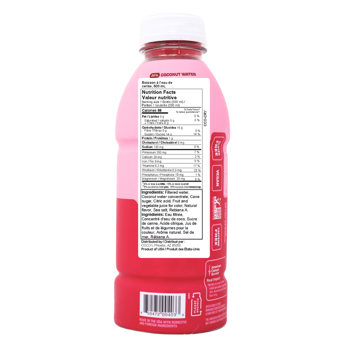 Filtered water, Coconut water concentrate, Cane sugar, Citric acid, Fruit and vegetable juice for colour, Natural flavour, Sea salt, Rebiana A.