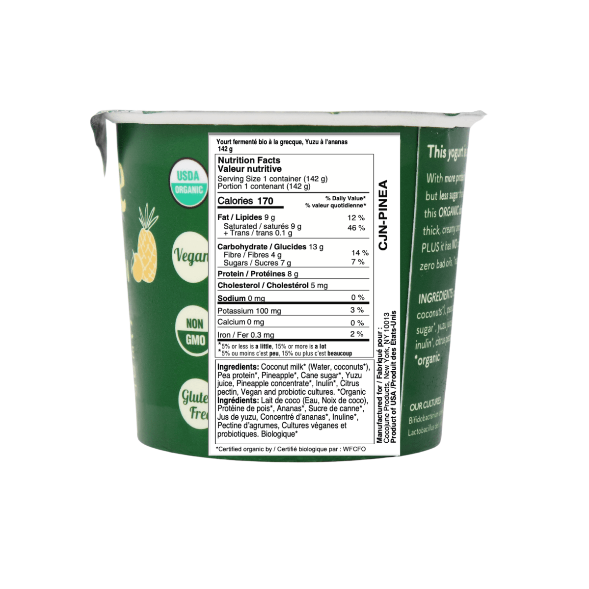 Coconut milk* (Water, coconuts*), Pea protein*, Pineapple*, Cane sugar*, Yuzu juice, Pineapple concentrate*, Inulin*, Citrus pectin, Vegan and probiotic cultures. *Organic