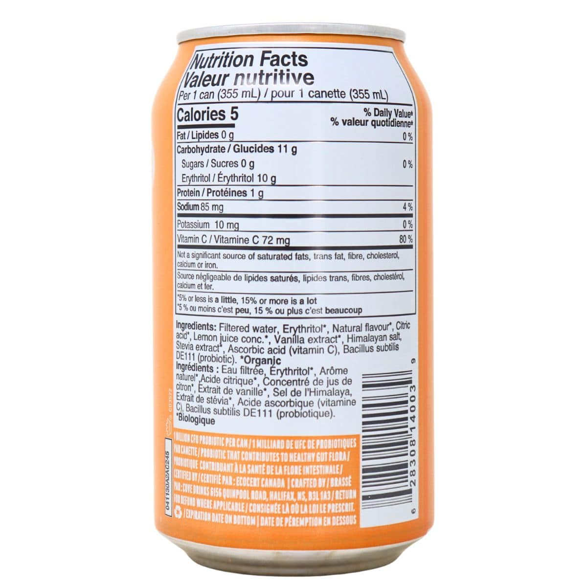 Filtered water, Erythritol*, Natural flavour*, Citric acid*, Lemon juice concentrate*, Vanilla extract*, Himalayan salt, Stevia extract*, Ascorbic acid (vitamin C), Bacillus subtilius DE111* (probiotic)