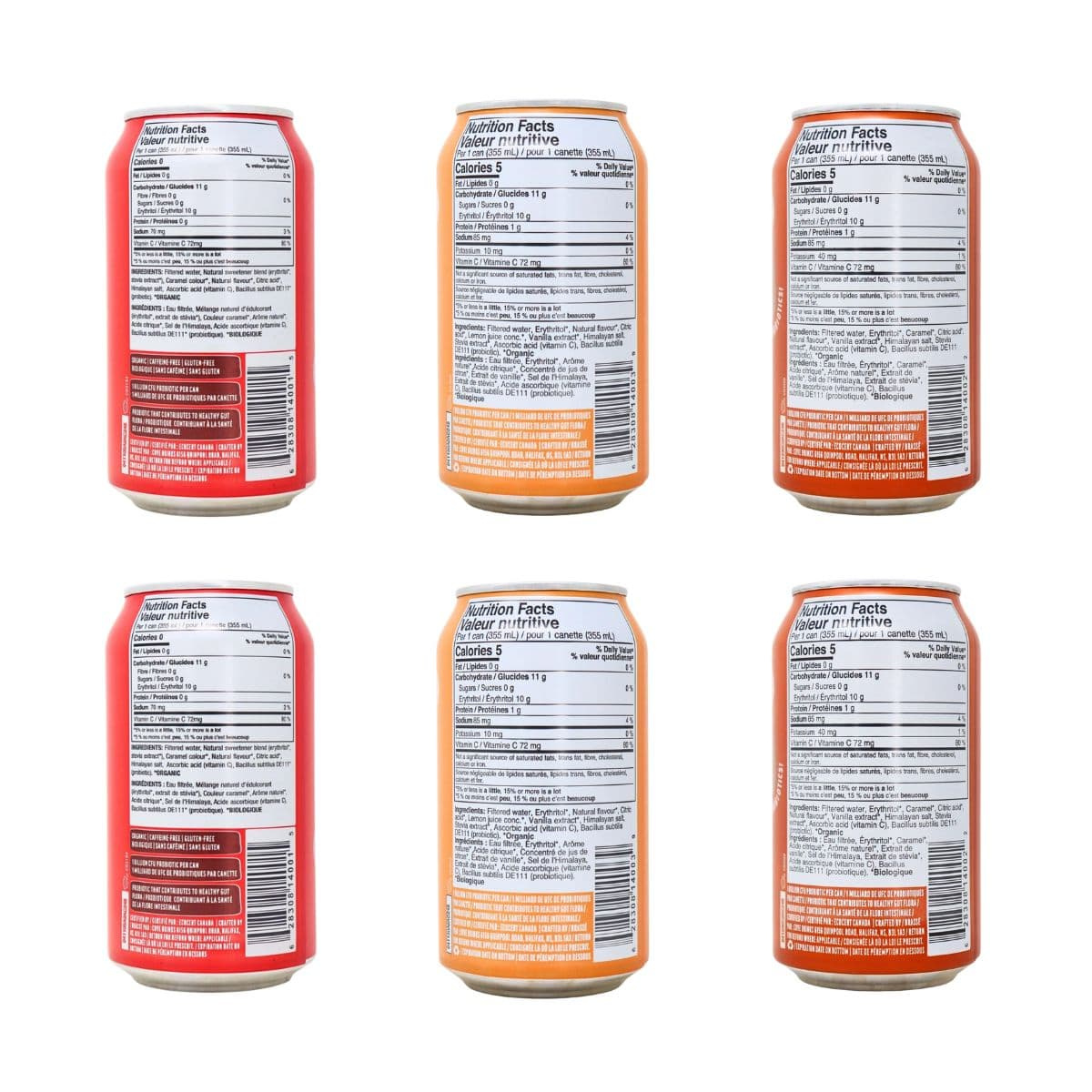 Root Beer - Filtered water, Erythritol*, Caramel*, Citric acid*, Natural flavour*, Vanilla extract*, Himalayan salt, Stevia extract*, Ascorbic acid (vitamin C), Bacillus subtilis DE111 (probiotic). *organic