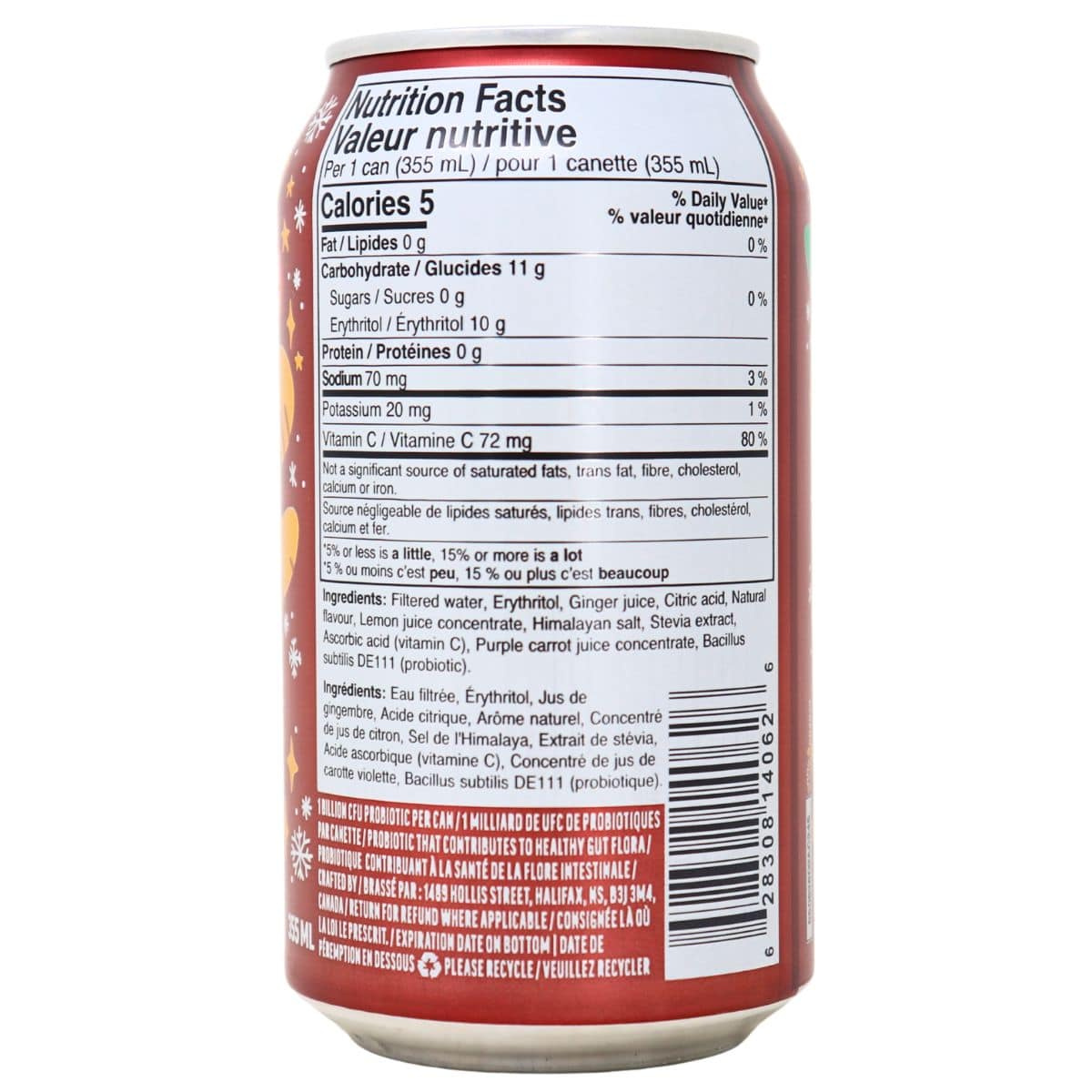 Filtered water, Erythritol, Ginger juice, Citric acid, Natural flavour, Lemon juice concentrate, Himalayan salt, Stevia extract, Ascorbic acid (vitamin C), Purple carrot juice concentrate, Bacillus subtilis DE111 (probiotic)