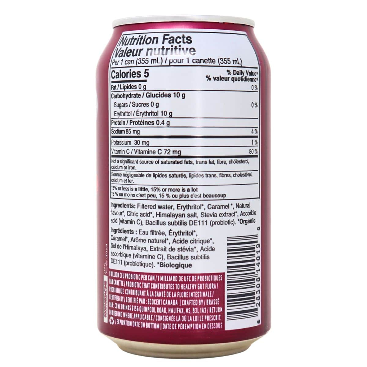 Filtered water, Erythritol*, Caramel*, Natural flavour*, Citric acid*, Himalayan salt, Stevia extract*, Ascorbic acid (vitamin C), Bacillus subtilis DE111 (probiotic).