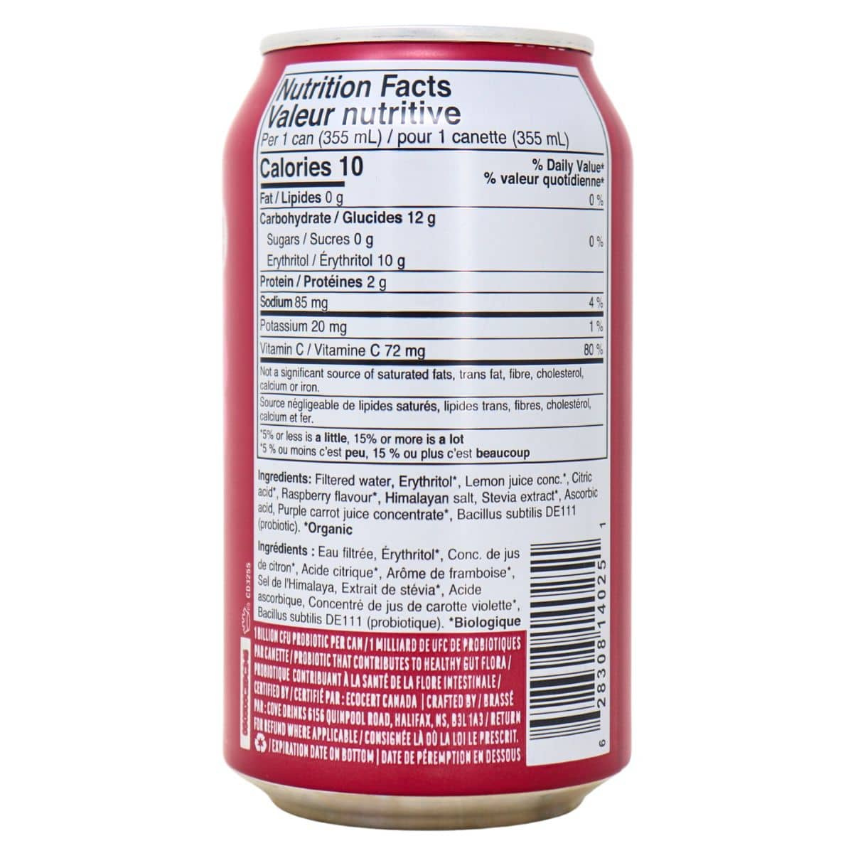 Filtered water, Erythritol*, Lemon juice concentrate*, Citric acid*, Raspberry flavour*, Himalayan salt, Stevia extract*, Ascorbic acid, Purple carrot juice concentrate*, Bacillus subtilis DE111 (probiotic)