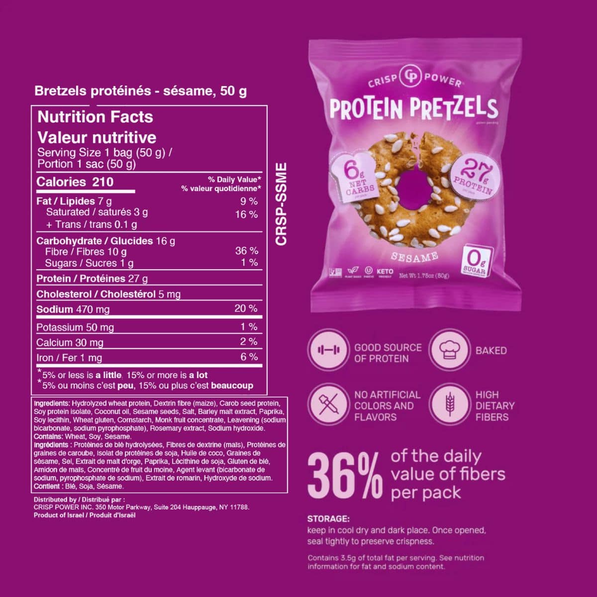 CRISP POWER Keto Plant-Based Protein Pretzels Sesame, 50g-Â Hydrolyzed wheat protein, Dextrin fibre (maize), Carob seed protein, Soy protein isolate, Hydrogenated coconut oil, Sesame seeds, Salt, Barley malt extract, Paprika, Soy lecithin, Wheat gluten, Cornstarch, Monk fruit concentrate, Leavening (sodium bicarbonate, sodium pyrophosphate), Rosemary extract, Sodium hydroxide.Contains: Wheat, Soy, Sesame.