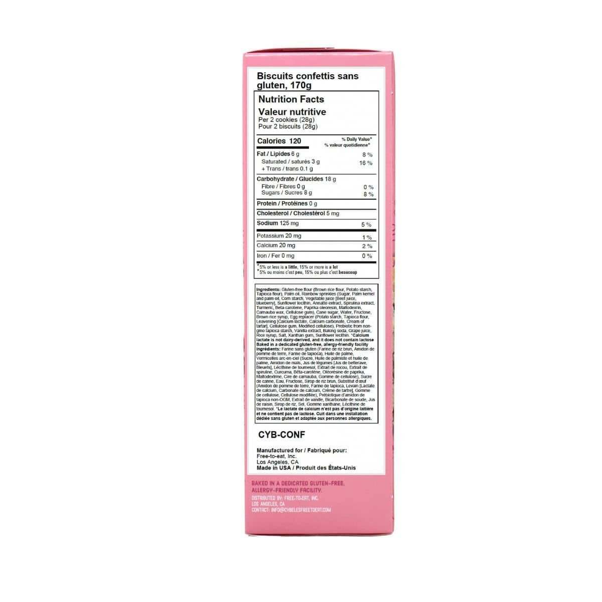 Gluten-free flour (Brown rice flour, Potato starch, Tapioca flour), Palm oil, Rainbow sprinkles (Sugar, Palm kernel and palm oil, Corn starch, Vegetable juice [Beet juice, blueberry], Sunflower lecithin, Annatto extract, Spirulina extract, Turmeric, Beta-carotene, Paprika oleoresin, Maltodexrin, Carnauba wax, Cellulose gum), Cane sugar, Water, Fructose, Brown rice syrup, Egg replacer (Potato starch, Tapioca flour, Leavening [Calcium lactate, Calcium carbonate, Cream of tartar], Cellulose gum, Modified cellulose), Prebiotic from non-gmo tapioca starch, Vanilla extract, Baking soda, Grape juice, Rice syrup, Salt, Xanthan gum, Sunflower lecithin.