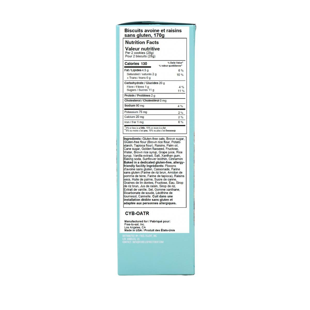 Gluten-free oats, Brown sugar, Gluten-free flour (Brown rice flour, Potato starch, Tapioca flour), Raisins, Palm oil, Cane sugar, Golden flaxseed, Fructose, Water, Brown rice syrup, Grape juice, Rice syrup, Vanilla extract, Salt, Xanthan gum, Baking soda, Sunflower lecithin, Cinnamon