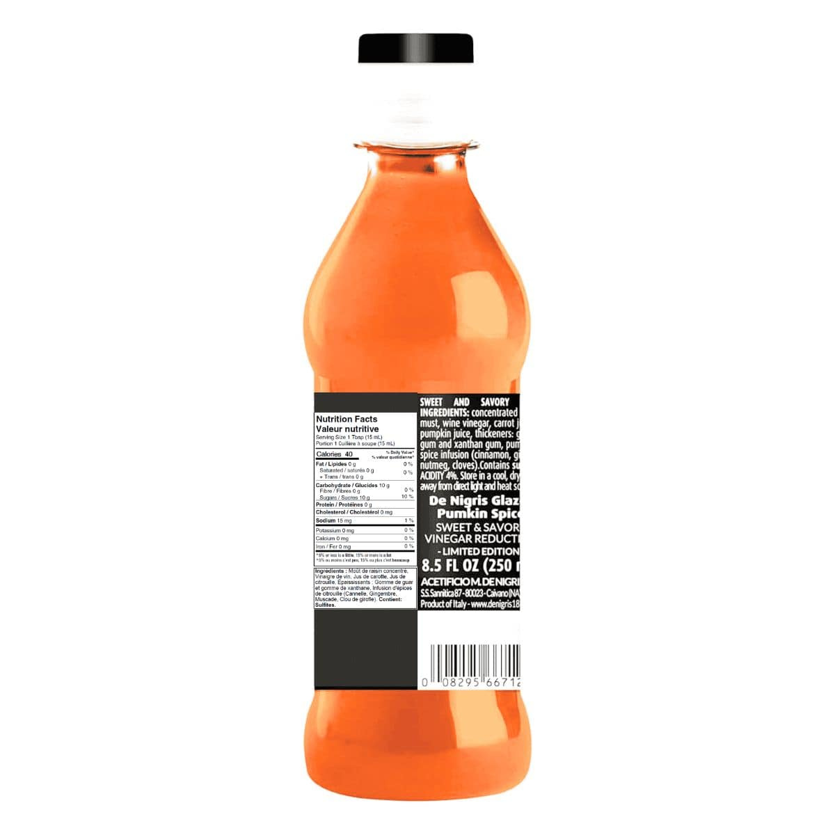 Concentrated Grape Must, Wine Vinegar, Carrot Juice, Pumpkin Juice, Thickeners: Guar Gum and Xanthan Gum, Pumpkin Spice Infusion (Cinnamon, ginger, Nutmeg, Cloves). Contains: Sulfites. Acidity 4%.
