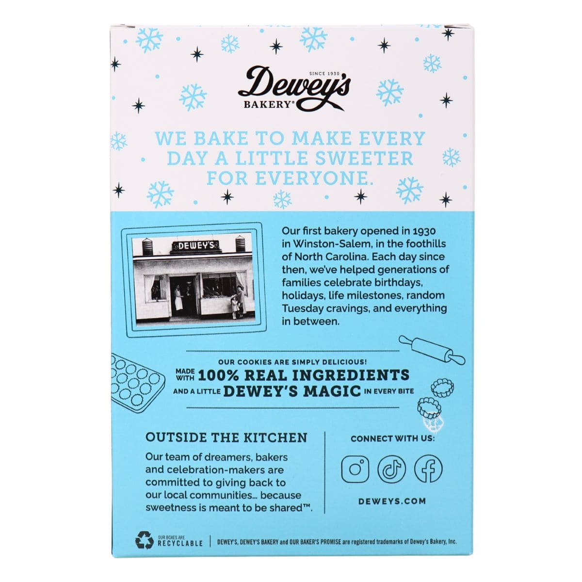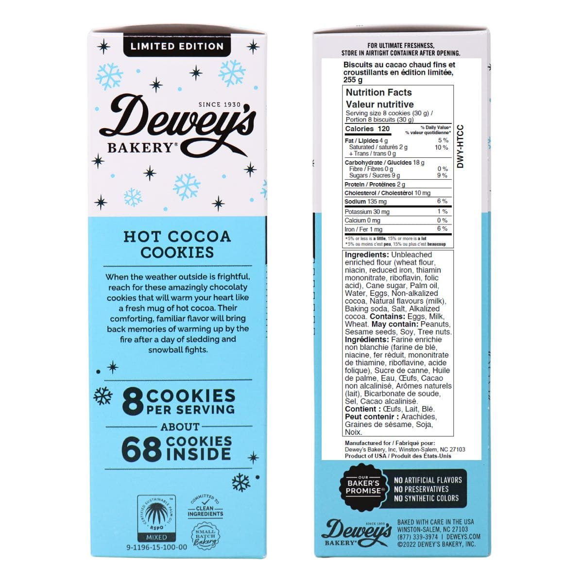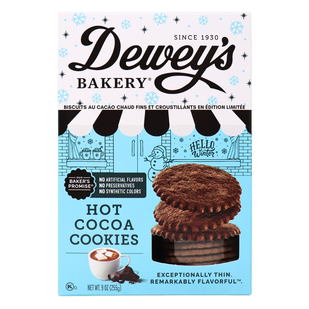 Why drink hot chocolate when you can eat it? Dewey’s hot cocoa cookies take the oh-so-yummy flavour of a piping hot mug of cocoa and transforms it into these thin, crispy chocolate cookies. Filled with all the chocolaty goodness and warmth you'd expect from a cup of hot chocolate, each bite will have you singing, “jingle bells, jingle bells, Dewey's all the way”!