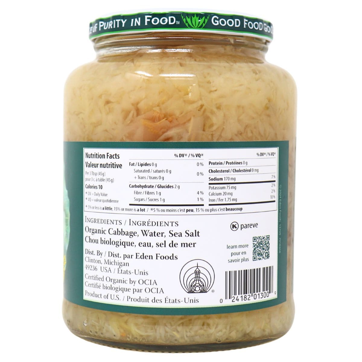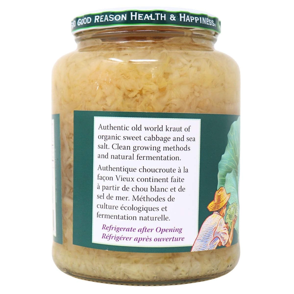 This is authentic kraut made solely using old-world methods. U.S.A. family organic cabbage is hand harvested at its peak, cored, washed, sliced, and fermented with sea salt. Generations of experience, traditional methods, and one family growing, making, and packing this kraut creates its traditional, beneficial character. A centuries old health food. No additives or preservatives of any kind. Glass jar packed. Refrigerate after opening.