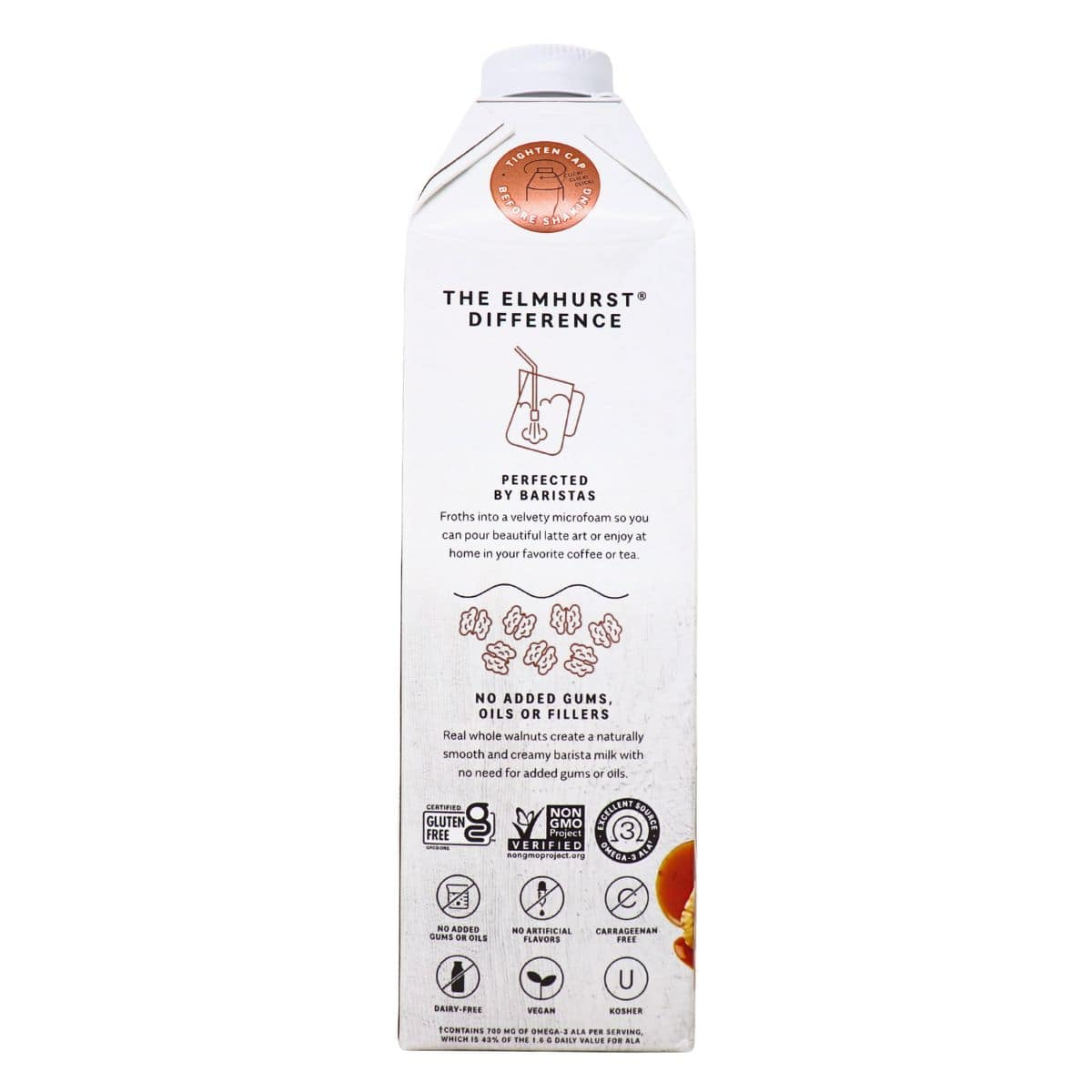 Whether you’re a barista, a blissful morning person or just someone who loves the taste of maple syrup, Elmhurst’s maple walnut barista milk is all it takes to make the perfect latte! With just 6 simple ingredients, including real maple syrup and nutty walnuts and no added gums or oils, this rich and frothy plant-based milk will transport your taste buds straight to a cozy cabin in the woods–complete with the perfect cup of coffee of course! Hot or cold, frothed or steamed, this barista milk alternative adds a touch of decadence and a little extra sweetness that you can feel good about!