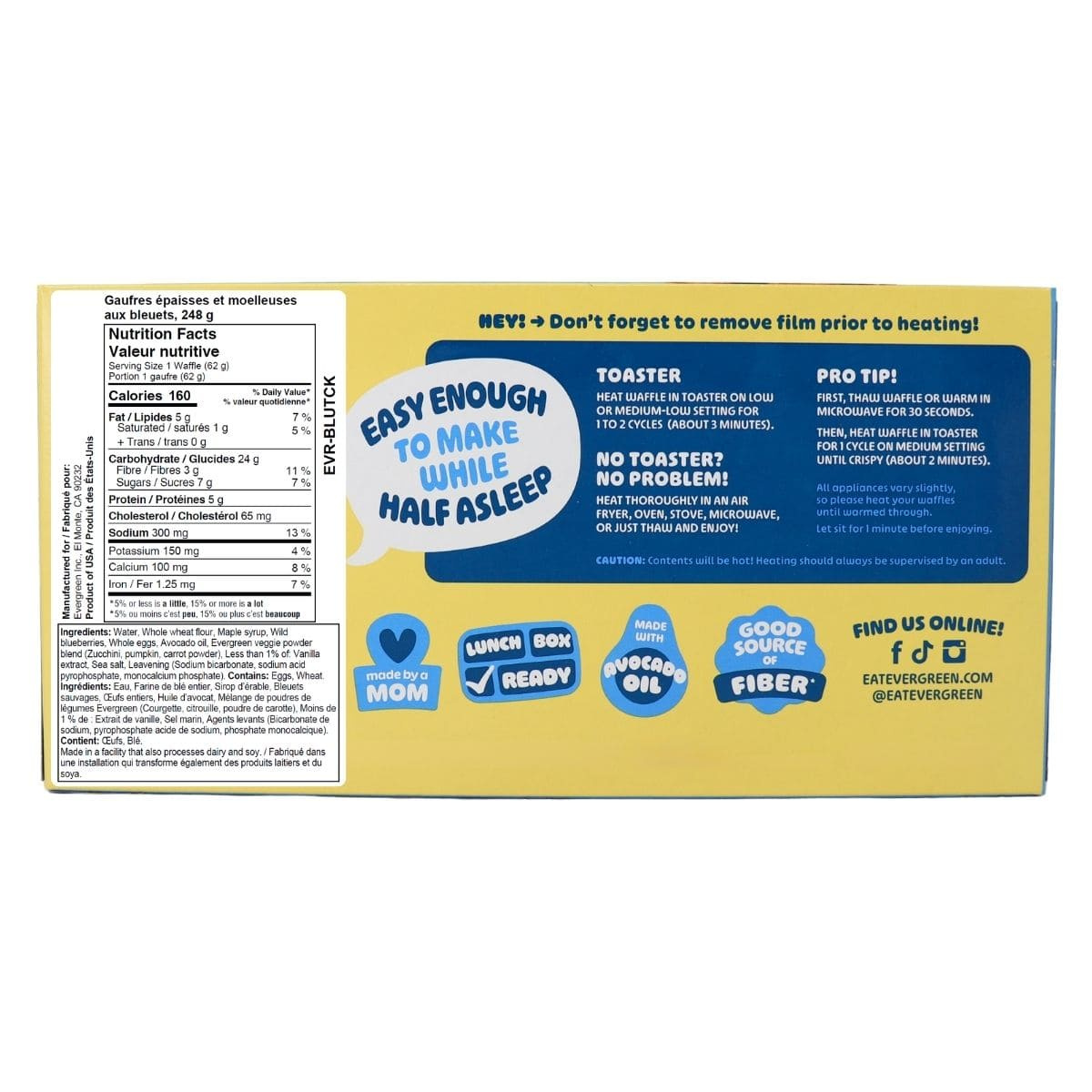 Golden crisp outside and soft inside, Evergreen Thick & Fluffy Blueberry Waffles bring classic breakfast comfort with a cleaner, modern twist. Each thick waffle is baked with hidden veggies, real blueberries, and 5 grams of protein for a wholesome start that tastes like the weekend.