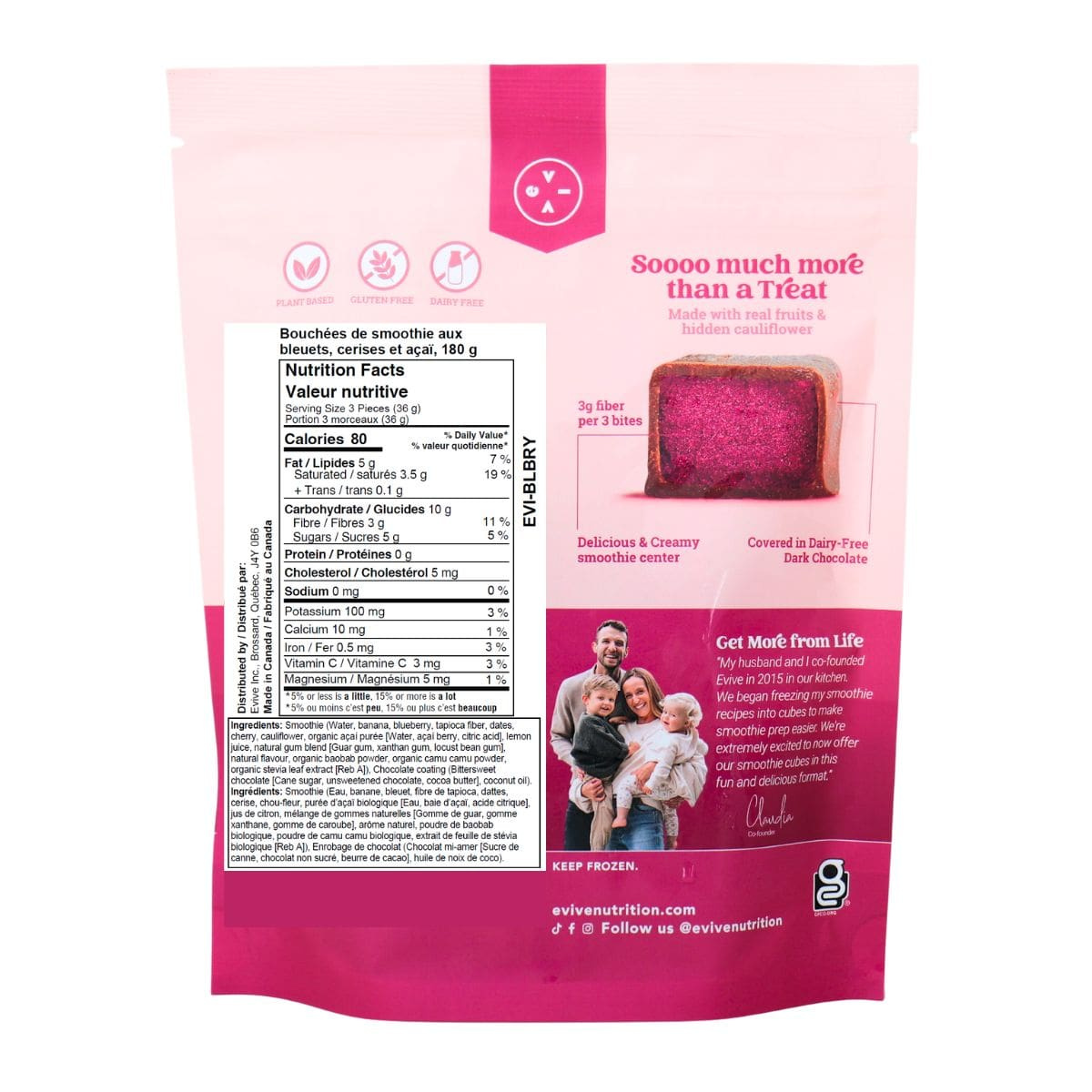 Juicy blueberries and dark cherries meet smooth chocolate for a frozen bite that hits every craving. Evive Smoothie Bites Blueberry Cherry Acai layers bold berry flavour with creamy texture and just the right amount of sweetness; no added sugar, no dairy, no gluten, and all the indulgence you want.