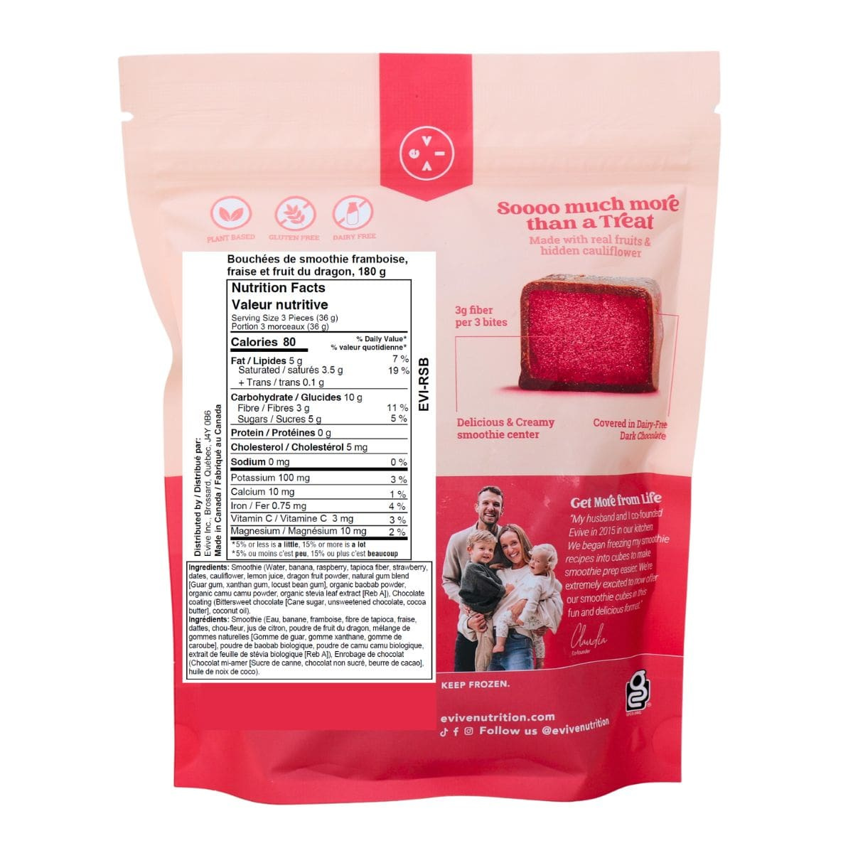 Evive Smoothie Bites make smoothies feel fresh; no blender, no prep, just pure, portioned joy. Raspberry Strawberry Dragon Fruit delivers vibrant flavour in every chocolate-coated cube, ready to thaw, snack, and enjoy.