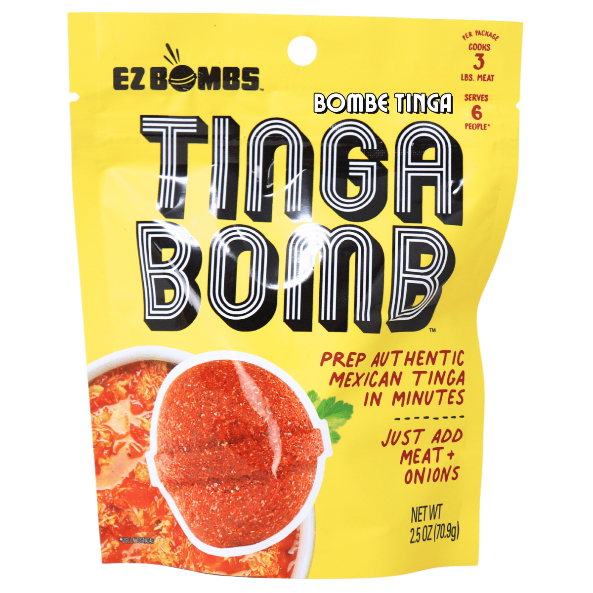 Smoky chipotle and rich tomato flavours combine in this easy-to-use spice bomb that jumpstarts authentic tinga chicken. Bring the smoky, spicy flavour of traditional Mexican tinga chicken to your kitchen with EZ Bombs Tinga Spice Bomb.Â