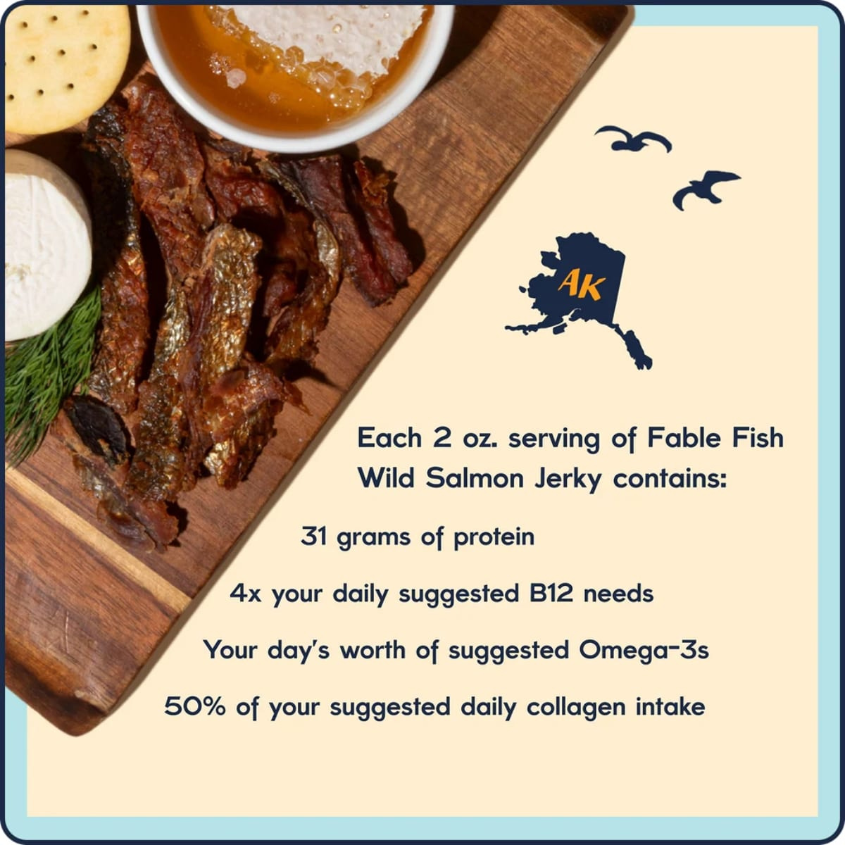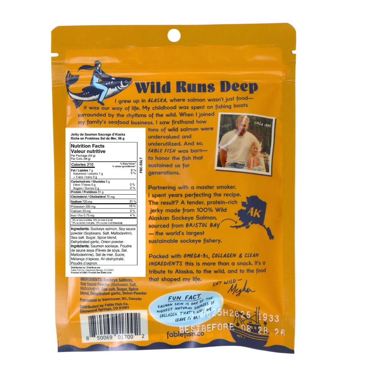 Simple, pure, and packed with flavour, Fable Fish Co. High-Protein Wild Alaskan Salmon Jerky Sea Salt lets the quality of wild-caught salmon shine. Lightly seasoned with sea salt to enhance its naturally rich, smoky flavour, this jerky delivers a clean, satisfying taste that’s as close to the ocean as it gets.