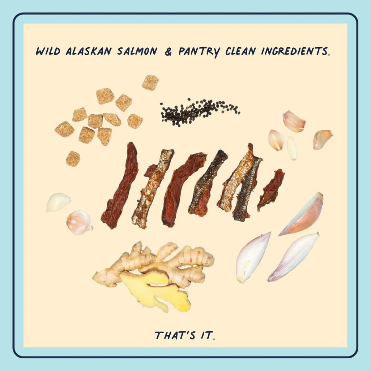 Sockeye salmon, Soy sauce powder (Soybeans, Salt, Maltodextrin), Sea salt, Sugar, Spice blend, Dehydrated garlic, Onion powder.