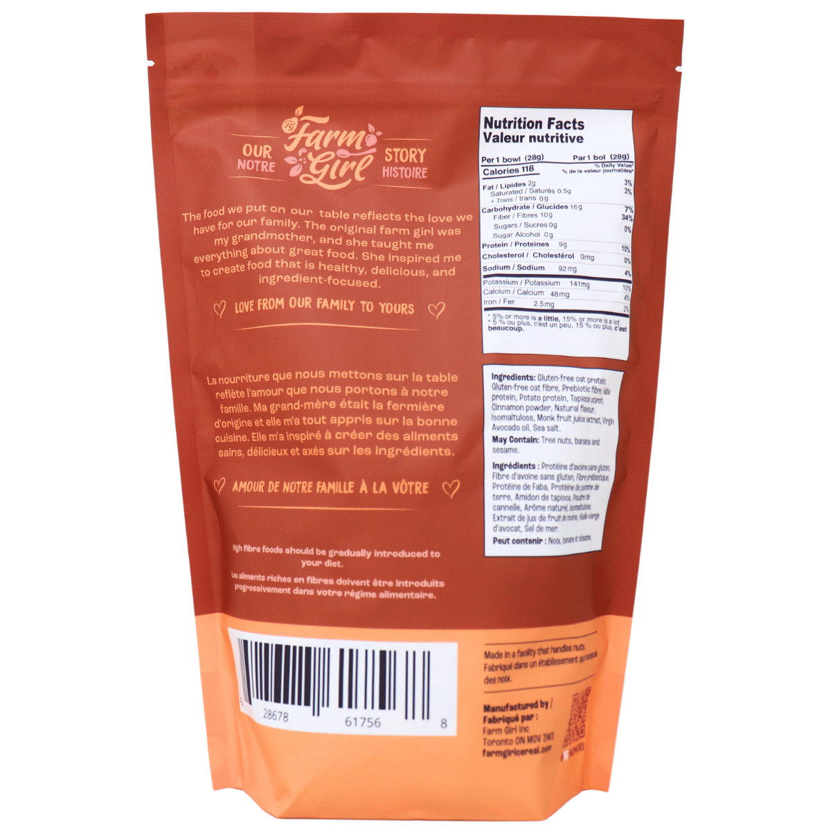 Gluten-free oat protein, Gluten-free oat fibre, Prebiotic fibre, Faba protein, Potato protein, Tapioca starch, Cinnamon powder, Natural flavour, Isomaltulose, Monk fruit juice extract, Virgin avocado oil, Sea salt.