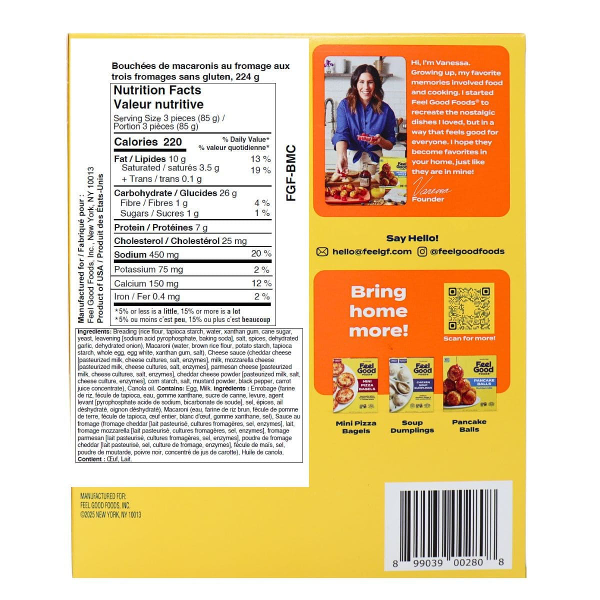 Feel Good Foods Three Cheese Mac & Cheese Bites take a nostalgic comfort food and give it a gluten-free upgrade. Each bite-sized mac & cheese bite is filled with real macaroni and a blend of three cheeses, all wrapped in a light, crispy coating that bakes or air-fries to golden perfection. The inside stays creamy and rich while the outside gives you that satisfying fried breaded crunch you crave. There are no artificial preservatives or additives, just a clean ingredient list that keeps things delicious & gluten-free. Ideal for quick snacks, entertaining, or anytime you want some cheesy comfort food without the hassle. These bites go straight from freezer to plate and pair perfectly with ketchup, ranch, or your favourite dipping sauce.