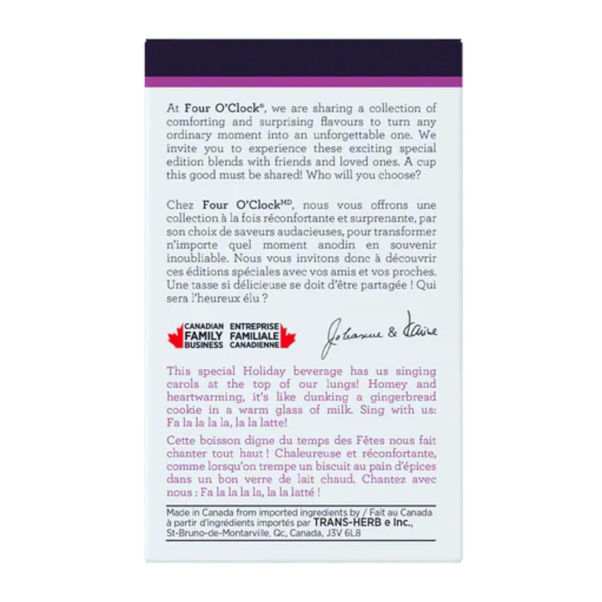 Are you ready to jingle all the way to flavour town this winter with Four O’Clock’s organic gingerbread tea? With warming aromatics and spices like cloves, cinnamon, and of course, ginger, this creamy caffeine-free herbal tea tastes just like a freshly baked gingerbread! Sweet, spicy, and oh-so nostalgic, just add in a splash of milk or cream, and you’ve got the perfect gingerbread latte that’ll rival even your favourite coffee shop. Get ready to sip your way into the holiday spirit with Four O'Clock!
