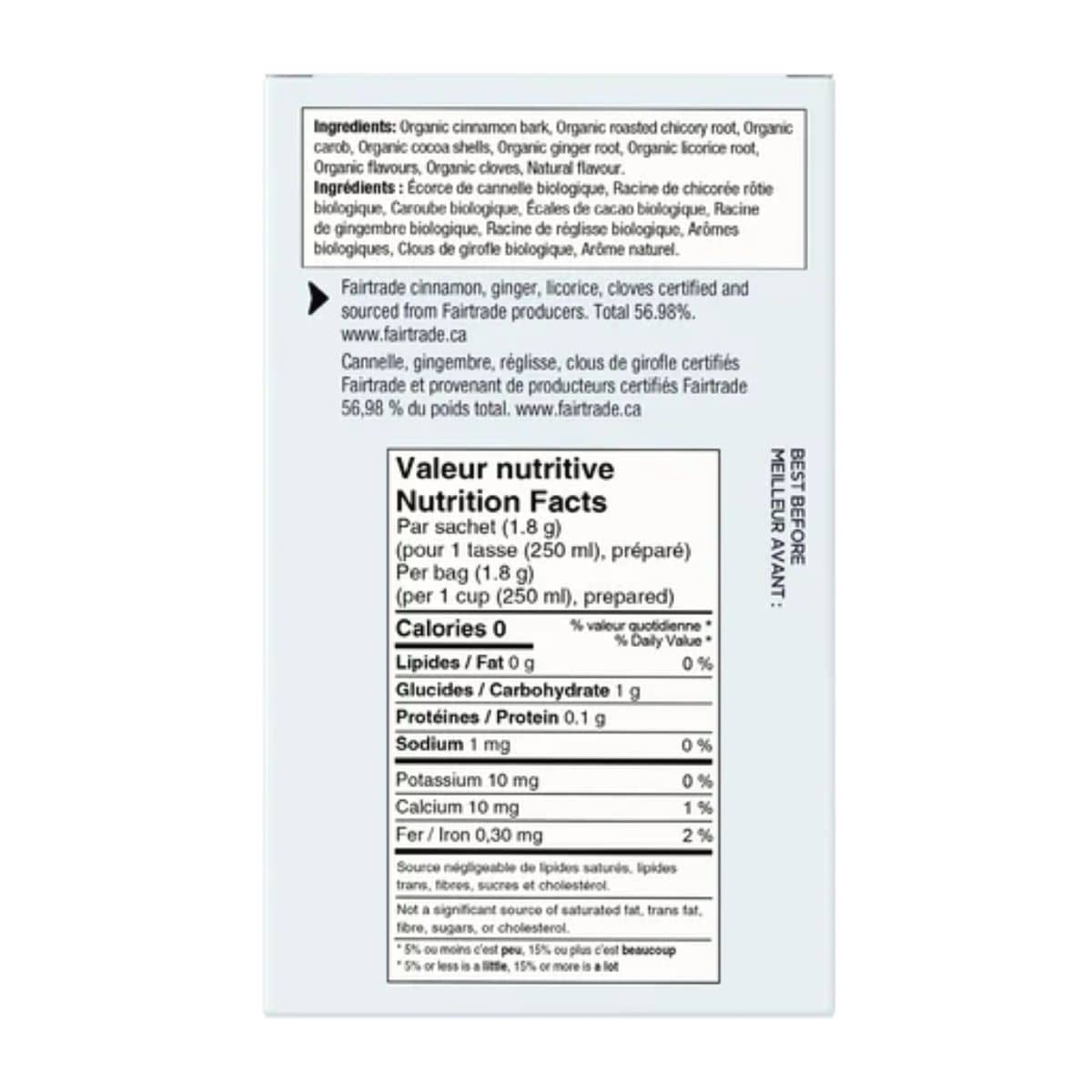 Organic cinnamon bark, Organic roasted chicory root, Organic carob, Organic cocoa shells, Organic ginger root, Organic licorice root, Organic flavours, Organic cloves, Natural flavour.