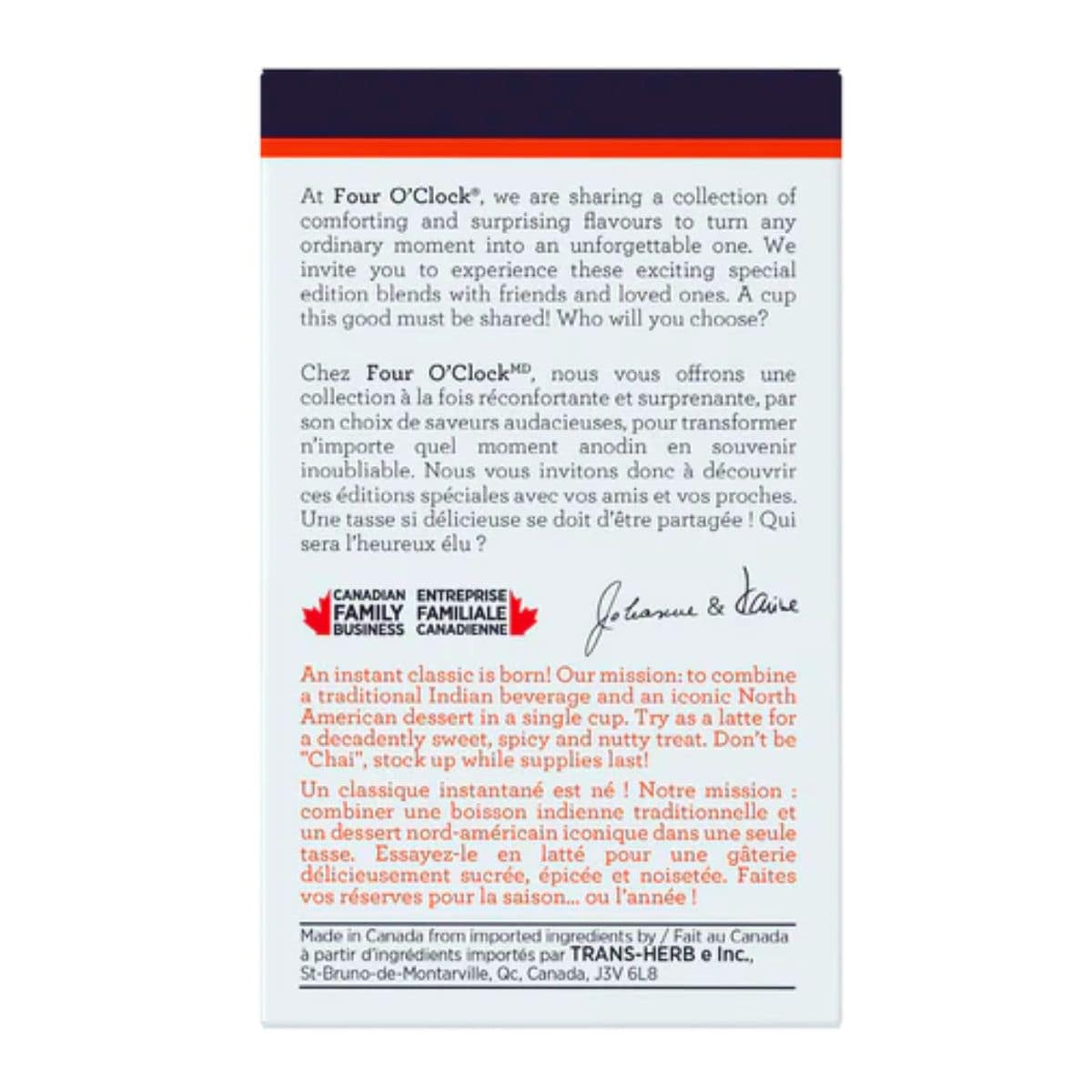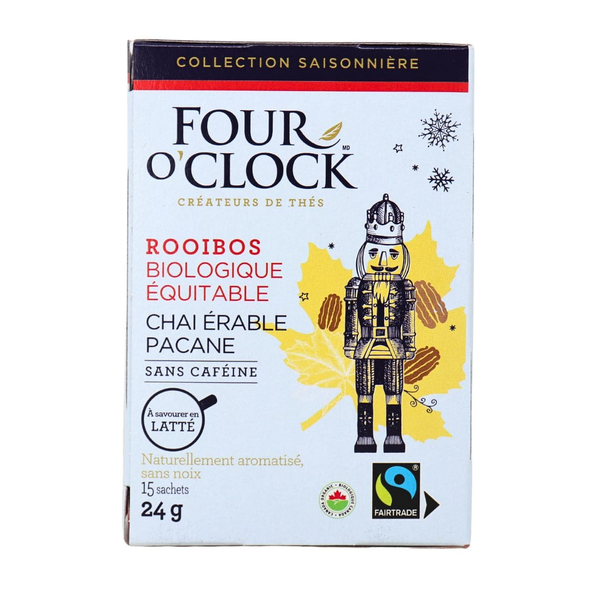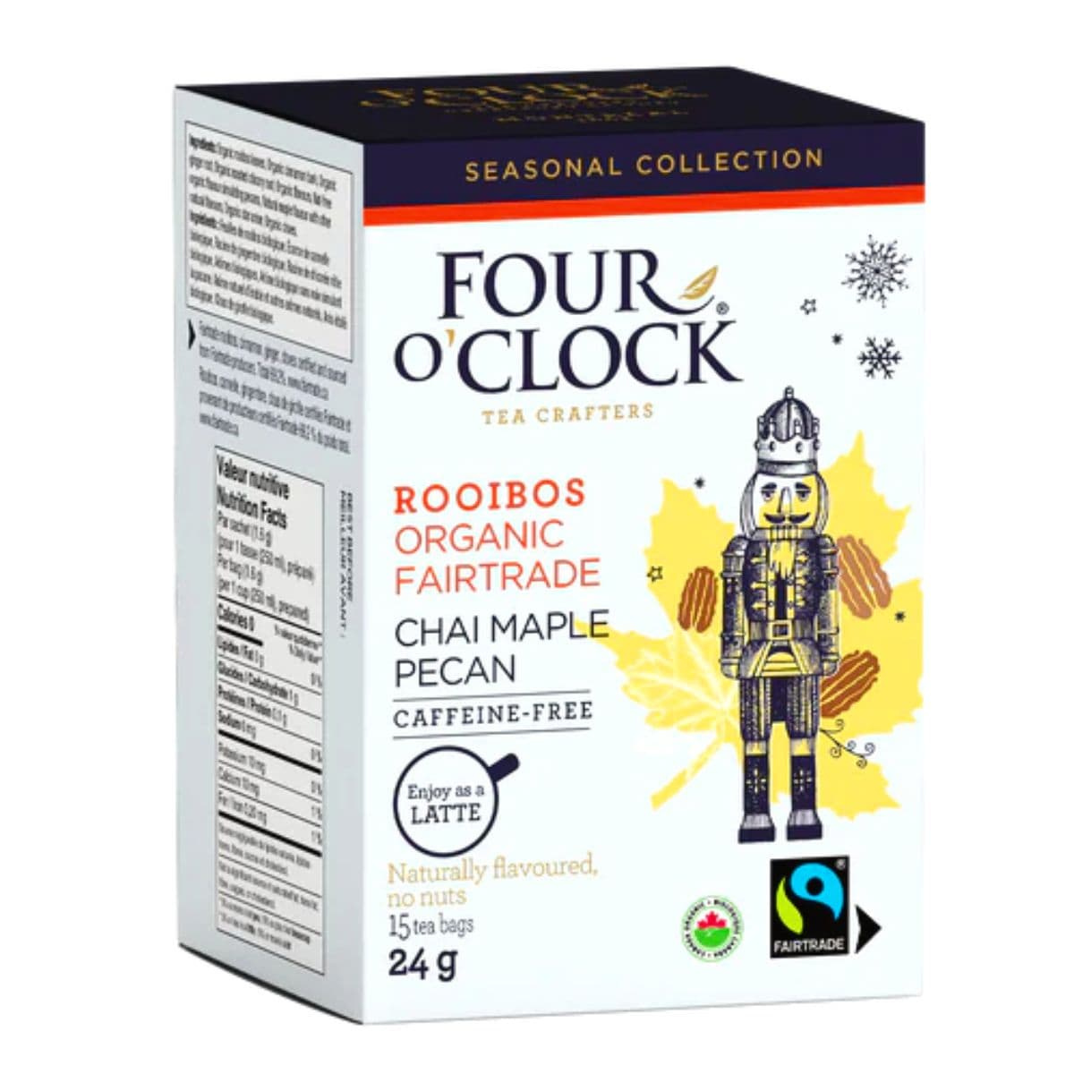 Four O’Clock’s organic holiday tea is a whirlwind of warm and cozy deliciousness that ready to spice up your life! With buttery and sweet maple, nutty toasted pecans and the aromatics of a classic chai–we’re talking cinnamon, ginger, and star anise–every sip of this maple pecan tea wraps you up in a warm and comforting embrace you wouldn’t be-leaf! It's the perfect blend of warmth and wonder, specially crafted for the most wonderful time of the year! Whether you're starting your day or winding down in the evening, you’ll be fallin’ Four O’Clock’s chai maple pecan rooibos tea with every sip!