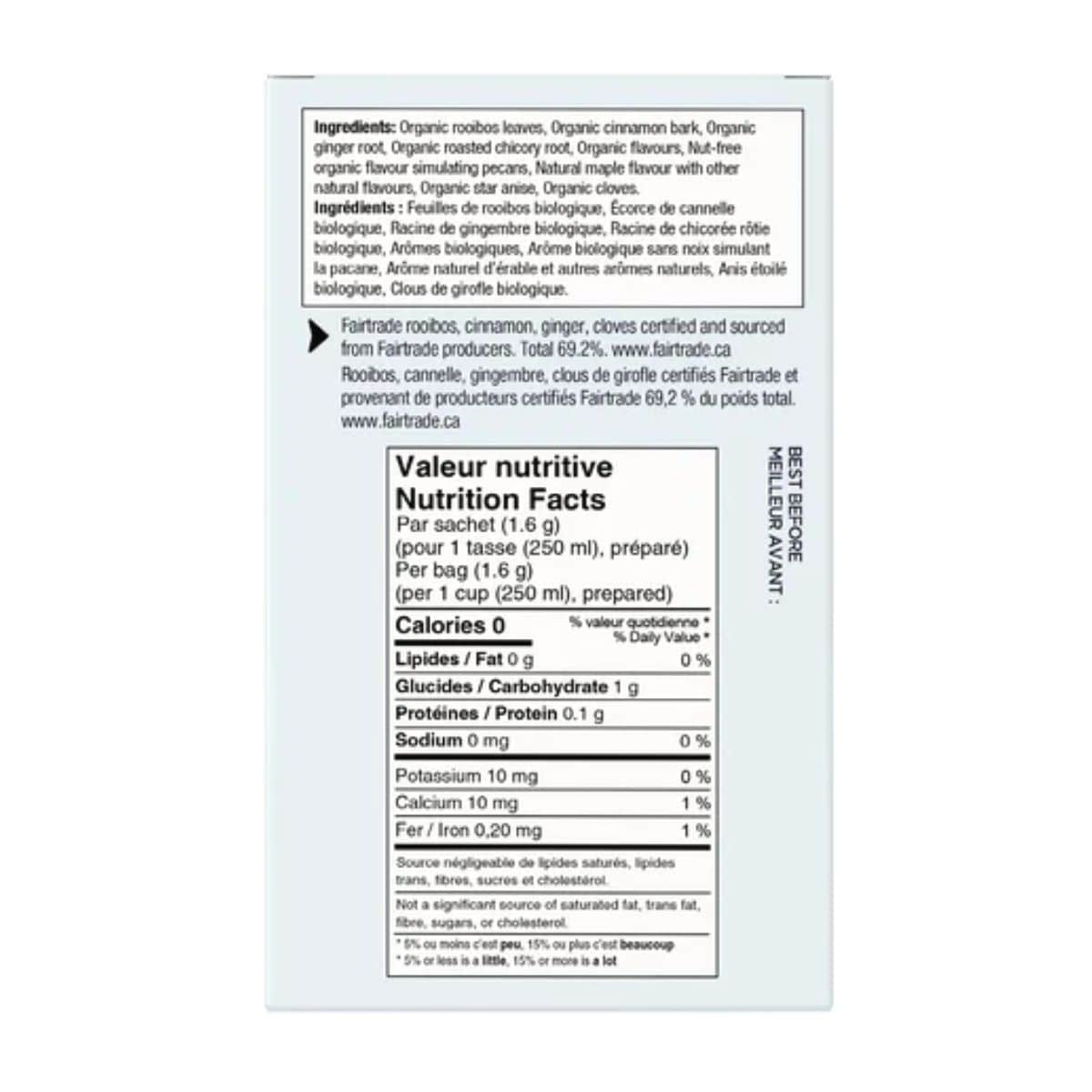 Organic rooibos leaves, Organic cinnamon bark, Organic ginger root, Organic roasted chicory root, Organic flavours, Nut-free organic flavour simulating pecans, Natural maple flavour with other natural flavours, Organic star anise, Organic cloves.