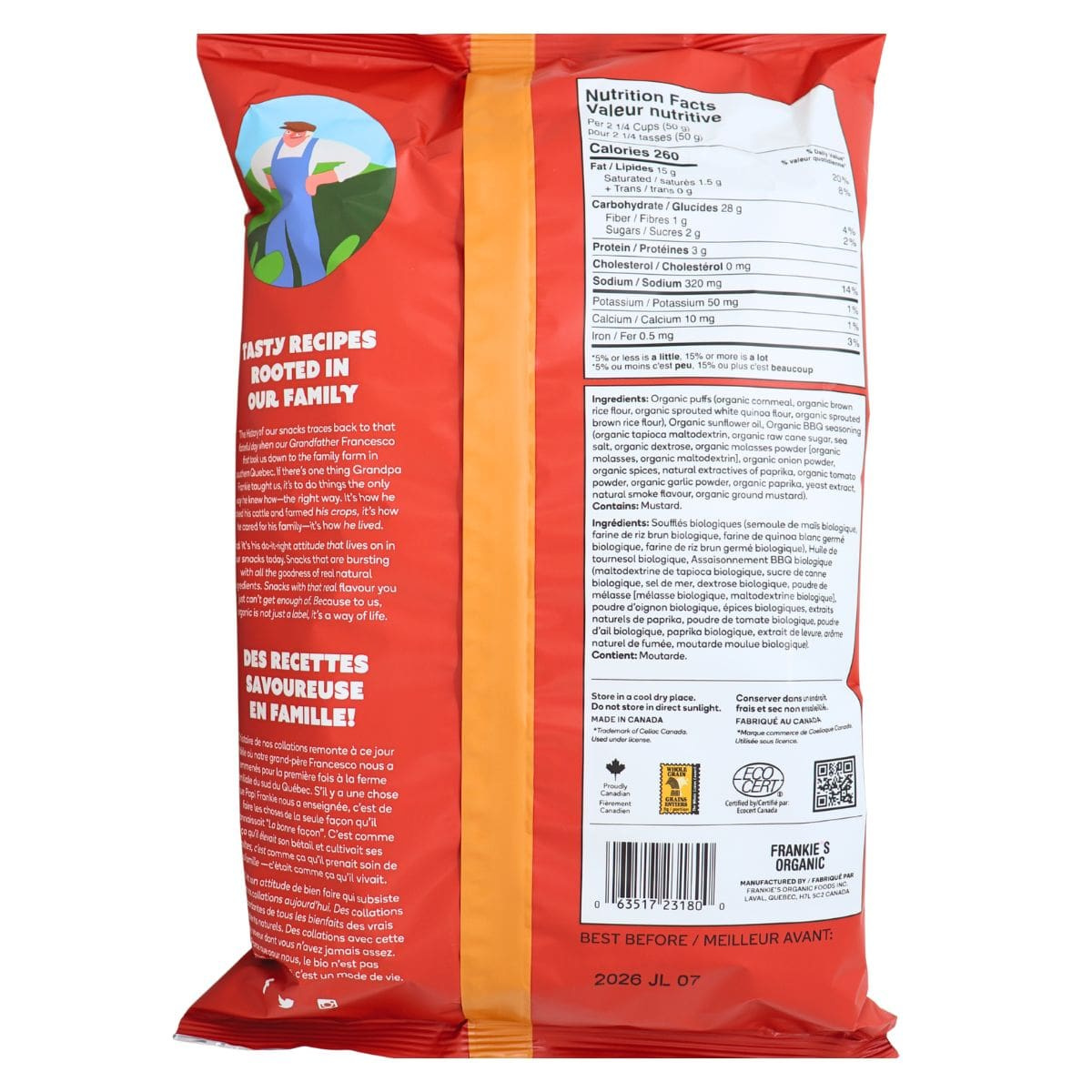 Frankie’s organic puffs aren't just a delicious puffed snack–they're a flavour explosion in every bite. Sweet, smoky, and tangy, these brown rice and quinoa puffs capture the irresistible flavour of the sizzling grill and fiery smoke. Oven-baked to light and airy perfection, giving you that satisfying crunch that you love without any of the heavy greasiness that you don’t! Gluten-free and vegan, it’s an irresistible puffed snack that brings everyone together, just like your summer backyard BBQ bash.