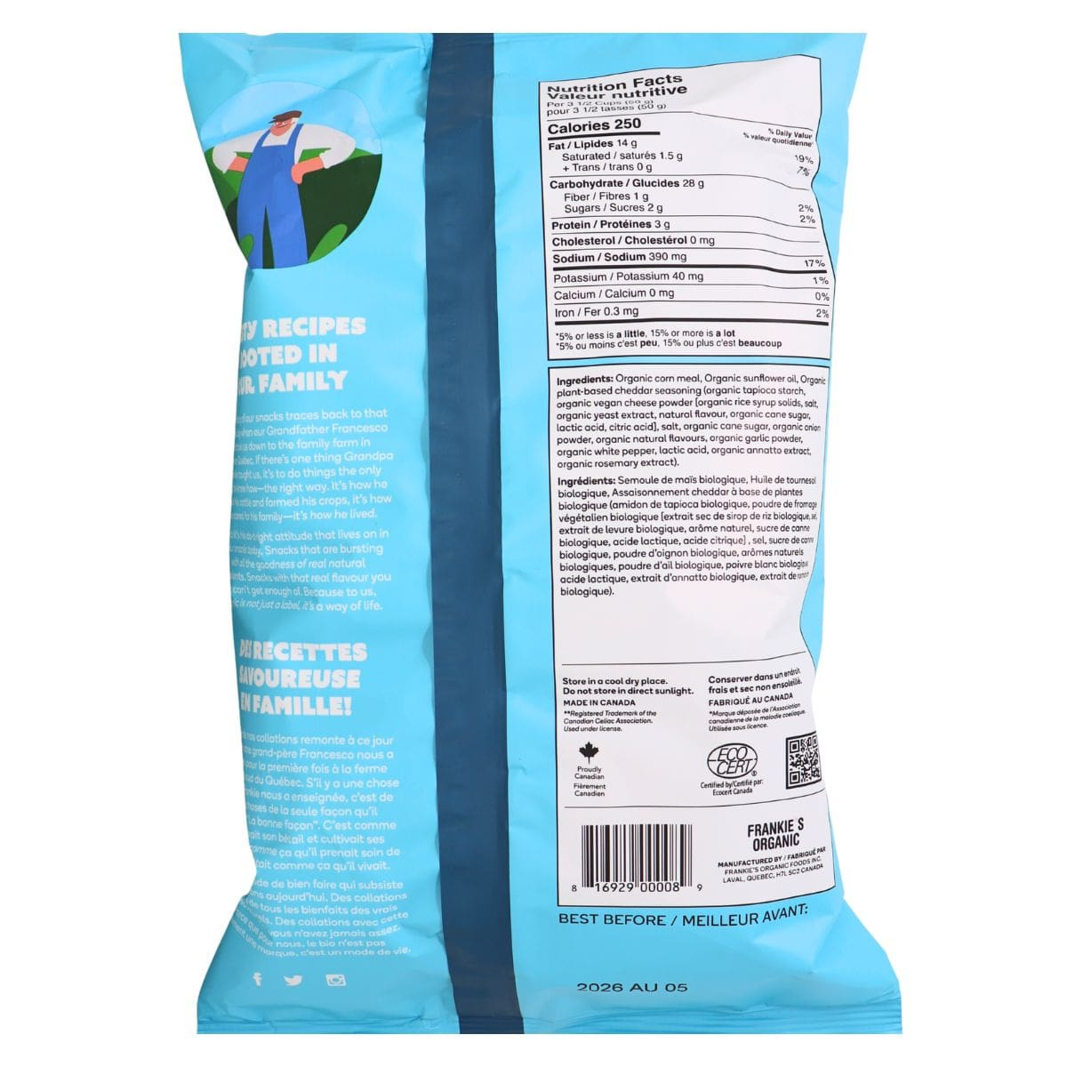 Organic corn meal, Organic sunflower oil, Organic plant-based cheddar seasoning (organic tapioca starch, organic vegan cheese powder [organic rice syrup solids, salt, organic yeast extract, natural flavour, organic cane sugar, lactic acid, citric acid], salt, organic cane sugar, organic onion powder, organic natural flavours, organic garlic powder, organic white pepper, lactic acid, organic annatto extract, organic rosemary extract).