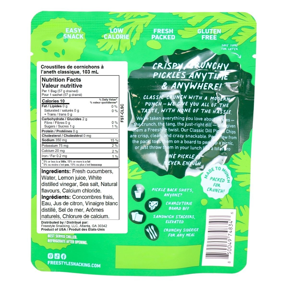 Crisp, tangy, and full of dill. Freestyle Snacks Classic Dill Pickle Chips take the refreshing taste of cucumbers and brine and turn it into a light, crunchy snack you’ll want to keep stocked in every bag. These crinkle-cut pickle chips deliver bright, briny flavour and a satisfying snap with every bite.Â