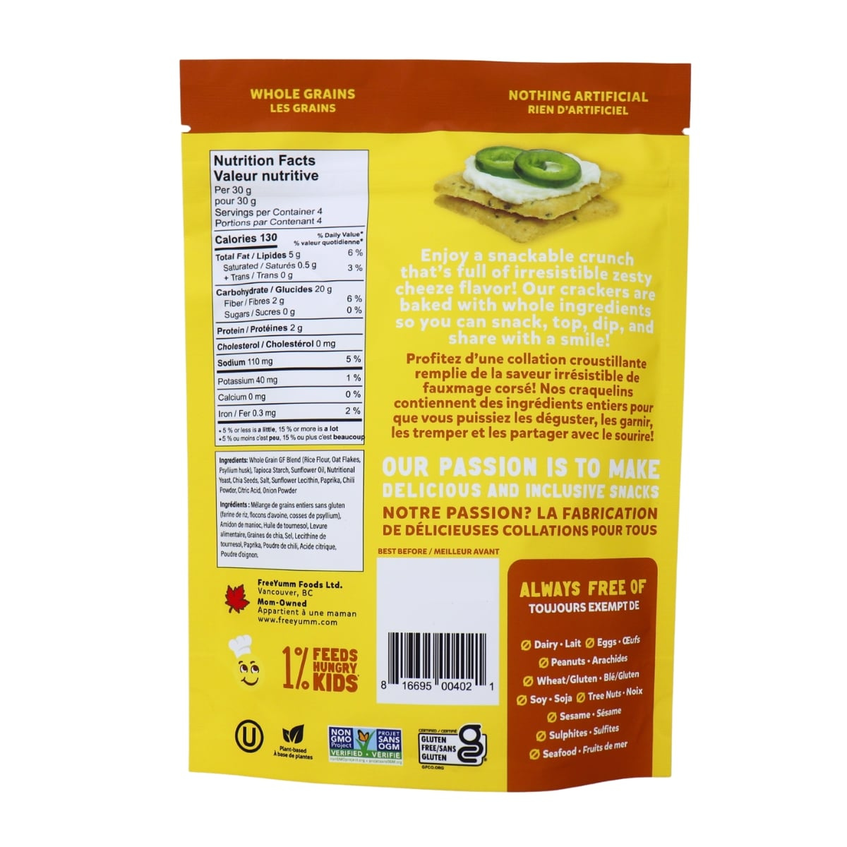 Freeyumm’s Allergen-Free Gluten-Free Zesty Cheeze Crackers bring big, bold flavour without any of the top 9 allergens. These ultra-crunchy crackers are baked with wholesome, simple ingredients and seasoned with a tangy, savoury “cheeze” blend that’s completely dairy-free, perfect for anyone who wants cheesy flavour without the allergens.