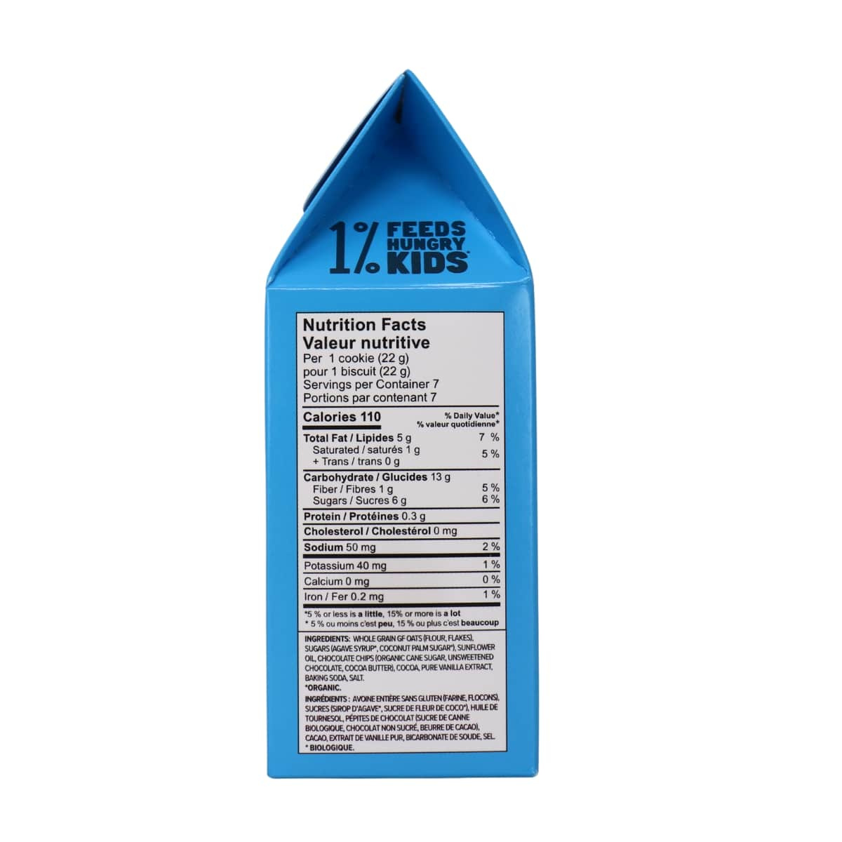 Whole grain GF oats (Flour, flakes), Sugars (Agave syrup*, Coconut palm sugar*), Sunflower oil, Chocolate chips (Organic cane sugar, Unsweetened chocolate, Cocoa butter), Cocoa, Pure vanilla extract, Baking soda, Salt. *Organic